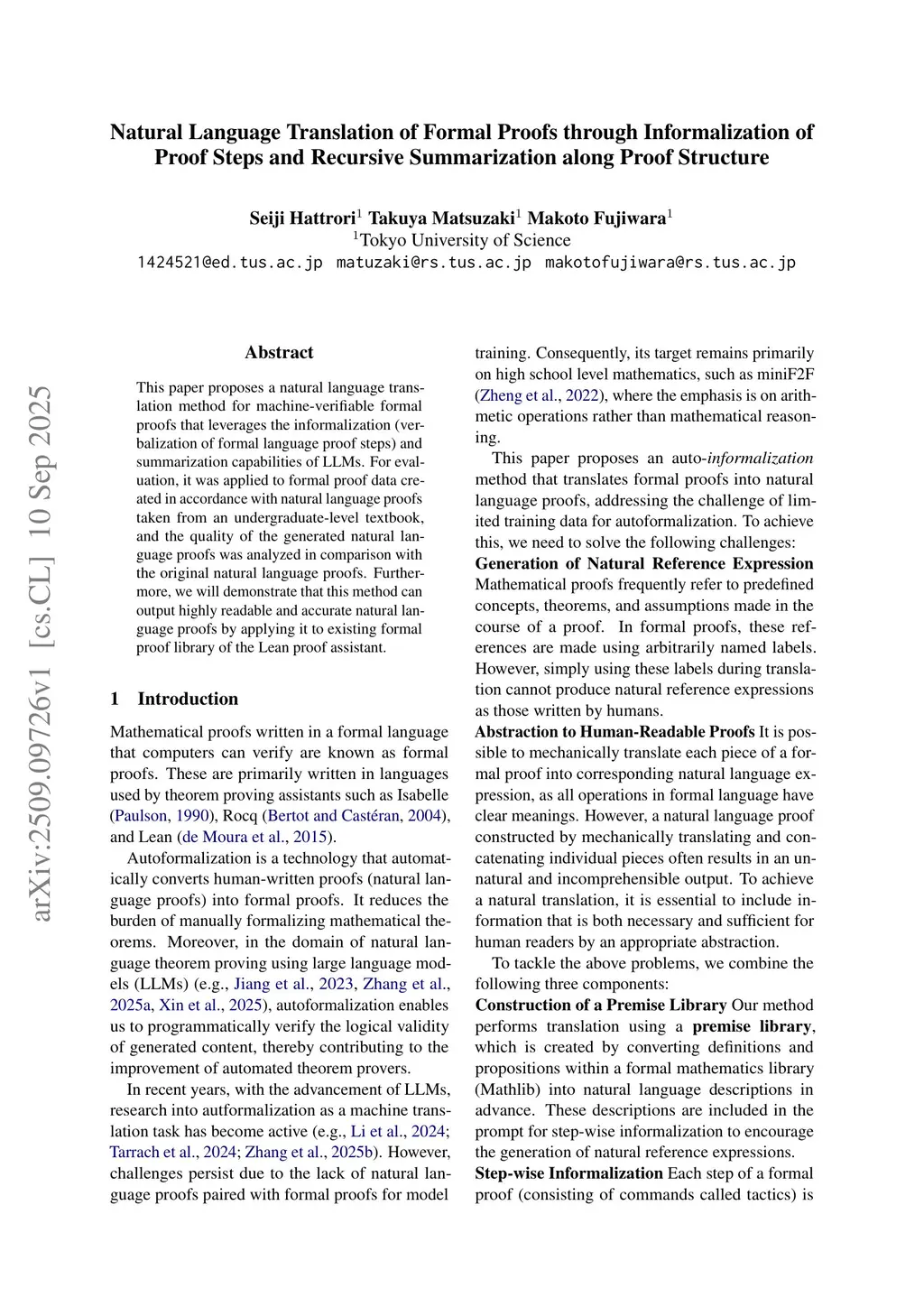 This paper proposes a natural language translation method for machine-verifiable formal proofs that leverages the informalization (verbalization of formal language proof steps) and summarization capabilities of LLMs. For evaluation, it was applied to formal proof data created in accordance with natural language proofs taken from an undergraduate-level textbook, and the quality of the generated natural language proofs was analyzed in comparison with the original natural language proofs. Furthermore, we will demonstrate that this method can output highly readable and accurate natural language proofs by applying it to existing formal proof library of the Lean proof assistant.