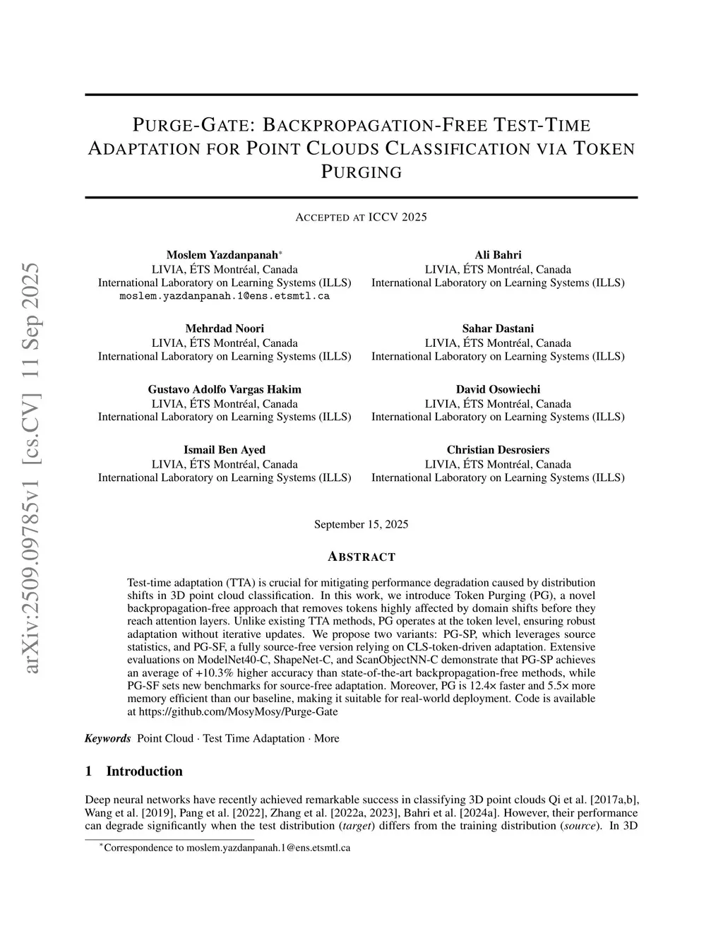 Purge-Gate: Backpropagation-Free Test-Time Adaptation for Point Clouds Classification via Token Purging