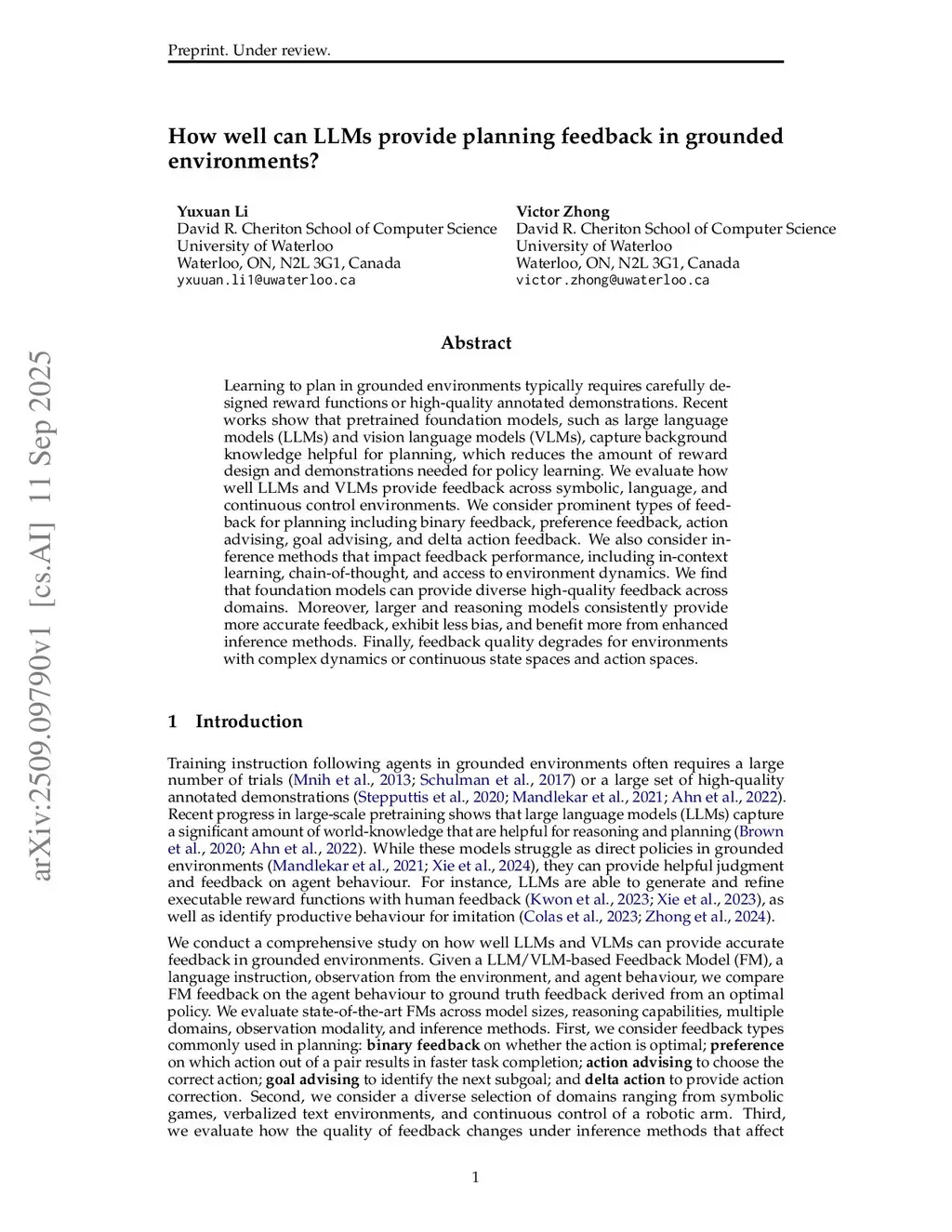 Learning to plan in grounded environments typically requires carefully designed reward functions or high-quality annotated demonstrations. Recent works show that pretrained foundation models, such as large language models (LLMs) and vision language models (VLMs), capture background knowledge helpful for planning, which reduces the amount of reward design and demonstrations needed for policy learning. We evaluate how well LLMs and VLMs provide feedback across symbolic, language, and continuous control environments. We consider prominent types of feedback for planning including binary feedback, preference feedback, action advising, goal advising, and delta action feedback. We also consider inference methods that impact feedback performance, including in-context learning, chain-of-thought, and access to environment dynamics. We find that foundation models can provide diverse high-quality feedback across domains. Moreover, larger and reasoning models consistently provide more accurate feedback, exhibit less bias, and benefit more from enhanced inference methods. Finally, feedback quality degrades for environments with complex dynamics or continuous state spaces and action spaces.