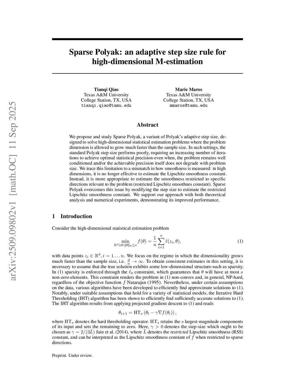 We propose and study Sparse Polyak, a variant of Polyak's adaptive step size, designed to solve high-dimensional statistical estimation problems where the problem dimension is allowed to grow much faster than the sample size. In such settings, the standard Polyak step size performs poorly, requiring an increasing number of iterations to achieve optimal statistical precision-even when, the problem remains well conditioned and/or the achievable precision itself does not degrade with problem size. We trace this limitation to a mismatch in how smoothness is measured: in high dimensions, it is no longer effective to estimate the Lipschitz smoothness constant. Instead, it is more appropriate to estimate the smoothness restricted to specific directions relevant to the problem (restricted Lipschitz smoothness constant). Sparse Polyak overcomes this issue by modifying the step size to estimate the restricted Lipschitz smoothness constant. We support our approach with both theoretical analysis and numerical experiments, demonstrating its improved performance.