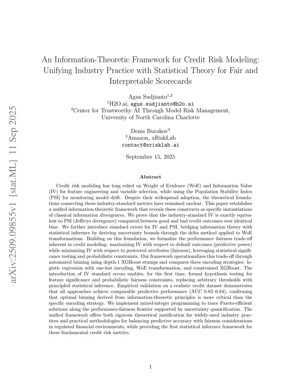 Credit risk modeling relies extensively on Weight of Evidence (WoE) and Information Value (IV) for feature engineering, and Population Stability Index (PSI) for drift monitoring, yet their theoretical foundations remain disconnected. We establish a unified information-theoretic framework revealing these industry-standard metrics as instances of classical information divergences. Specifically, we prove that IV exactly equals PSI (Jeffreys divergence) computed between good and bad credit outcomes over identical bins. Through the delta method applied to WoE transformations, we derive standard errors for IV and PSI, enabling formal hypothesis testing and probabilistic fairness constraints for the first time. We formalize credit modeling's inherent performance-fairness trade-off as maximizing IV for predictive power while minimizing IV for protected attributes. Using automated binning with depth-1 XGBoost stumps, we compare three encoding strategies: logistic regression with one-hot encoding, WoE transformation, and constrained XGBoost. All methods achieve comparable predictive performance (AUC 0.82-0.84), demonstrating that principled, information-theoretic binning outweighs encoding choice. Mixed-integer programming traces Pareto-efficient solutions along the performance-fairness frontier with uncertainty quantification. This framework bridges theory and practice, providing the first rigorous statistical foundation for widely-used credit risk metrics while offering principled tools for balancing accuracy and fairness in regulated environments.