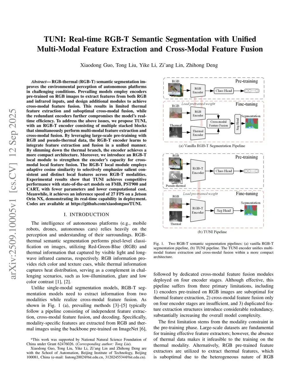 TUNI: Real-time RGB-T Semantic Segmentation with Unified Multi-Modal Feature Extraction and Cross-Modal Feature Fusion