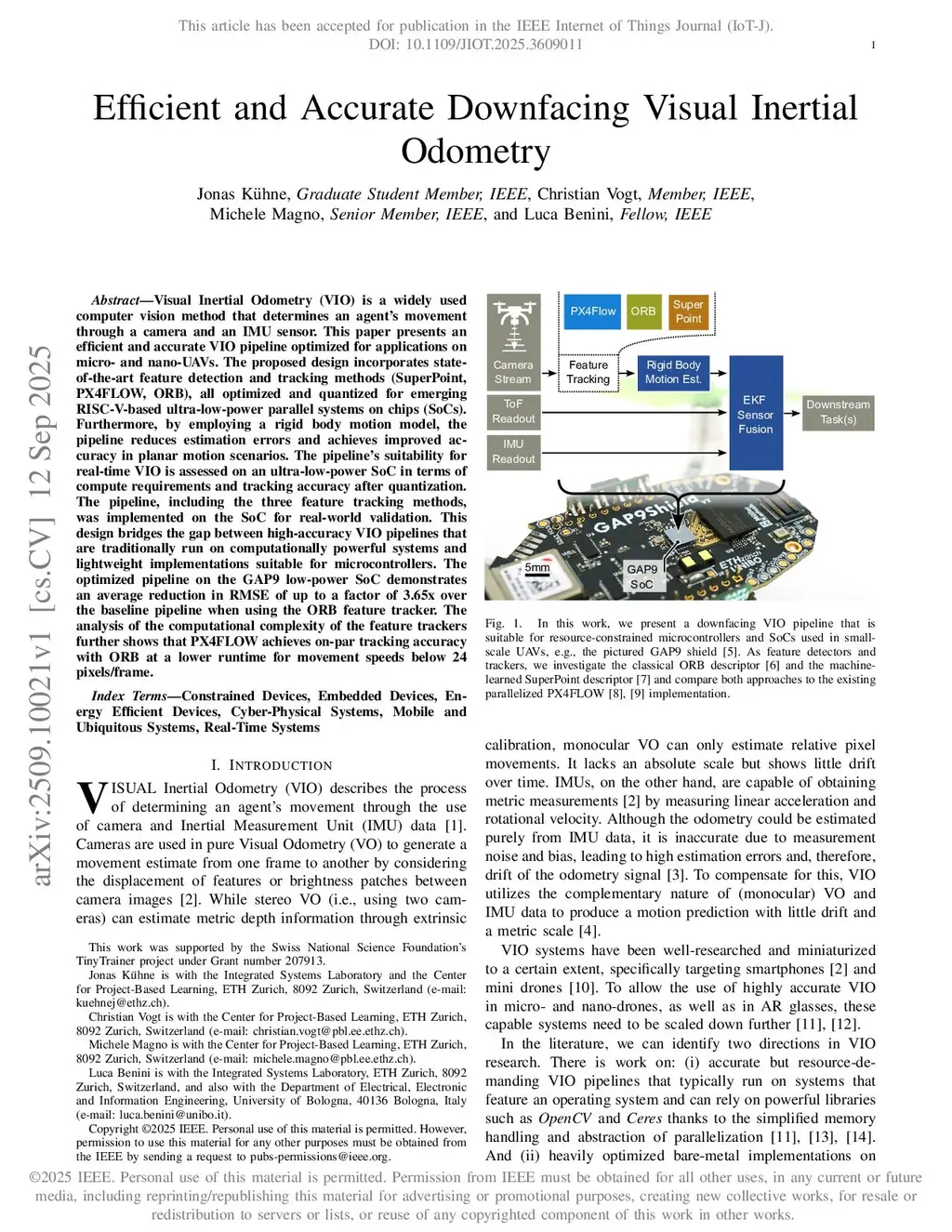 Visual Inertial Odometry (VIO) is a widely used computer vision method that determines an agent's movement through a camera and an IMU sensor. This paper presents an efficient and accurate VIO pipeline optimized for applications on micro- and nano-UAVs. The proposed design incorporates state-of-the-art feature detection and tracking methods (SuperPoint, PX4FLOW, ORB), all optimized and quantized for emerging RISC-V-based ultra-low-power parallel systems on chips (SoCs). Furthermore, by employing a rigid body motion model, the pipeline reduces estimation errors and achieves improved accuracy in planar motion scenarios. The pipeline's suitability for real-time VIO is assessed on an ultra-low-power SoC in terms of compute requirements and tracking accuracy after quantization. The pipeline, including the three feature tracking methods, was implemented on the SoC for real-world validation. This design bridges the gap between high-accuracy VIO pipelines that are traditionally run on computationally powerful systems and lightweight implementations suitable for microcontrollers. The optimized pipeline on the GAP9 low-power SoC demonstrates an average reduction in RMSE of up to a factor of 3.65x over the baseline pipeline when using the ORB feature tracker. The analysis of the computational complexity of the feature trackers further shows that PX4FLOW achieves on-par tracking accuracy with ORB at a lower runtime for movement speeds below 24 pixels/frame.