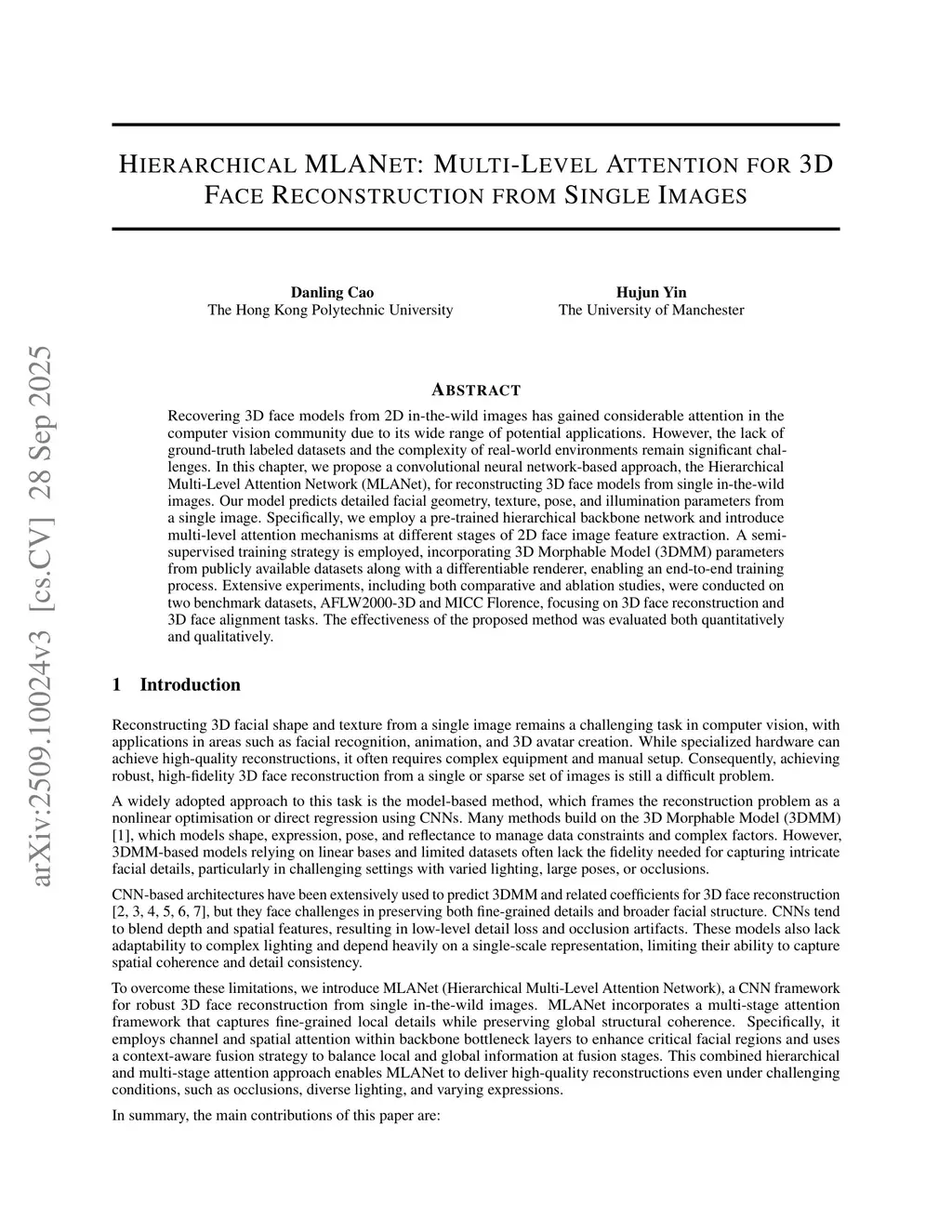 Recovering 3D face models from 2D in-the-wild images has gained considerable attention in the computer vision community due to its wide range of potential applications. However, the lack of ground-truth labeled datasets and the complexity of real-world environments remain significant challenges. In this chapter, we propose a convolutional neural network-based approach, the Hierarchical Multi-Level Attention Network (MLANet), for reconstructing 3D face models from single in-the-wild images. Our model predicts detailed facial geometry, texture, pose, and illumination parameters from a single image. Specifically, we employ a pre-trained hierarchical backbone network and introduce multi-level attention mechanisms at different stages of 2D face image feature extraction. A semi-supervised training strategy is employed, incorporating 3D Morphable Model (3DMM) parameters from publicly available datasets along with a differentiable renderer, enabling an end-to-end training process. Extensive experiments, including both comparative and ablation studies, were conducted on two benchmark datasets, AFLW2000-3D and MICC Florence, focusing on 3D face reconstruction and 3D face alignment tasks. The effectiveness of the proposed method was evaluated both quantitatively and qualitatively.