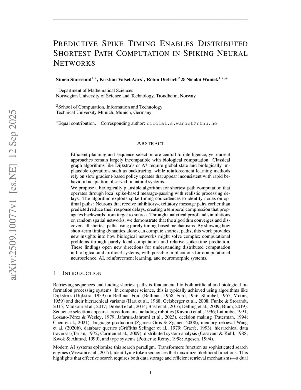 Efficient planning and sequence selection are central to intelligence, yet current approaches remain largely incompatible with biological computation. Classical graph algorithms like Dijkstra's or A* require global state and biologically implausible operations such as backtracing, while reinforcement learning methods rely on slow gradient-based policy updates that appear inconsistent with rapid behavioral adaptation observed in natural systems.We propose a biologically plausible algorithm for shortest-path computation that operates through local spike-based message-passing with realistic processing delays. The algorithm exploits spike-timing coincidences to identify nodes on optimal paths: Neurons that receive inhibitory-excitatory message pairs earlier than predicted reduce their response delays, creating a temporal compression that propagates backwards from target to source. Through analytical proof and simulations on random spatial networks, we demonstrate that the algorithm converges and discovers all shortest paths using purely timing-based mechanisms. By showing how short-term timing dynamics alone can compute shortest paths, this work provides new insights into how biological networks might solve complex computational problems through purely local computation and relative spike-time prediction. These findings open new directions for understanding distributed computation in biological and artificial systems, with possible implications for computational neuroscience, AI, reinforcement learning, and neuromorphic systems.