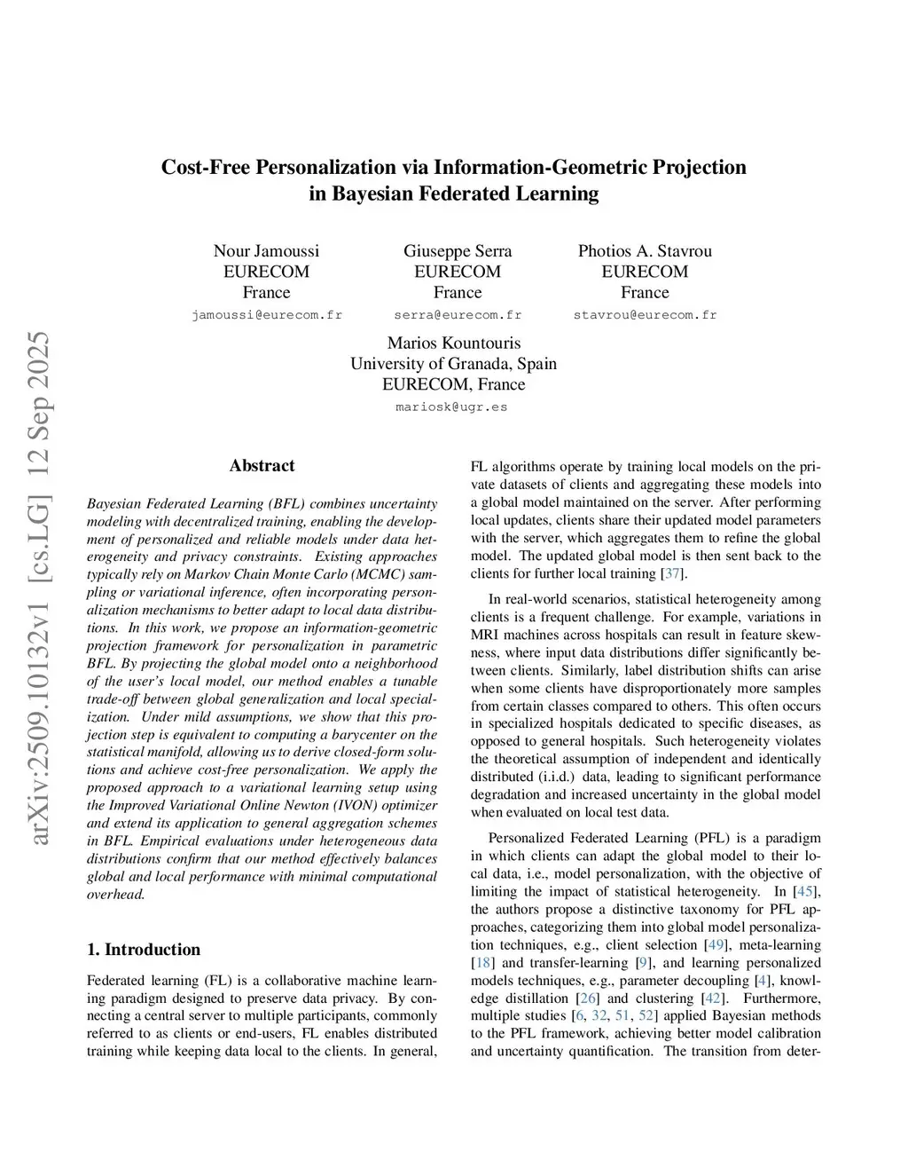 Bayesian Federated Learning (BFL) combines uncertainty modeling with decentralized training, enabling the development of personalized and reliable models under data heterogeneity and privacy constraints. Existing approaches typically rely on Markov Chain Monte Carlo (MCMC) sampling or variational inference, often incorporating personalization mechanisms to better adapt to local data distributions. In this work, we propose an information-geometric projection framework for personalization in parametric BFL. By projecting the global model onto a neighborhood of the user's local model, our method enables a tunable trade-off between global generalization and local specialization. Under mild assumptions, we show that this projection step is equivalent to computing a barycenter on the statistical manifold, allowing us to derive closed-form solutions and achieve cost-free personalization. We apply the proposed approach to a variational learning setup using the Improved Variational Online Newton (IVON) optimizer and extend its application to general aggregation schemes in BFL. Empirical evaluations under heterogeneous data distributions confirm that our method effectively balances global and local performance with minimal computational overhead.