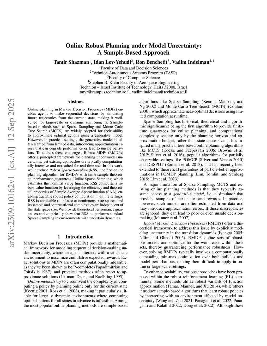 Online planning in Markov Decision Processes (MDPs) enables agents to make sequential decisions by simulating future trajectories from the current state, making it well-suited for large-scale or dynamic environments. Sample-based methods such as Sparse Sampling and Monte Carlo Tree Search (MCTS) are widely adopted for their ability to approximate optimal actions using a generative model. However, in practical settings, the generative model is often learned from limited data, introducing approximation errors that can degrade performance or lead to unsafe behaviors. To address these challenges, Robust MDPs (RMDPs) offer a principled framework for planning under model uncertainty, yet existing approaches are typically computationally intensive and not suited for real-time use. In this work, we introduce Robust Sparse Sampling (RSS), the first online planning algorithm for RMDPs with finite-sample theoretical performance guarantees. Unlike Sparse Sampling, which estimates the nominal value function, RSS computes a robust value function by leveraging the efficiency and theoretical properties of Sample Average Approximation (SAA), enabling tractable robust policy computation in online settings. RSS is applicable to infinite or continuous state spaces, and its sample and computational complexities are independent of the state space size. We provide theoretical performance guarantees and empirically show that RSS outperforms standard Sparse Sampling in environments with uncertain dynamics.