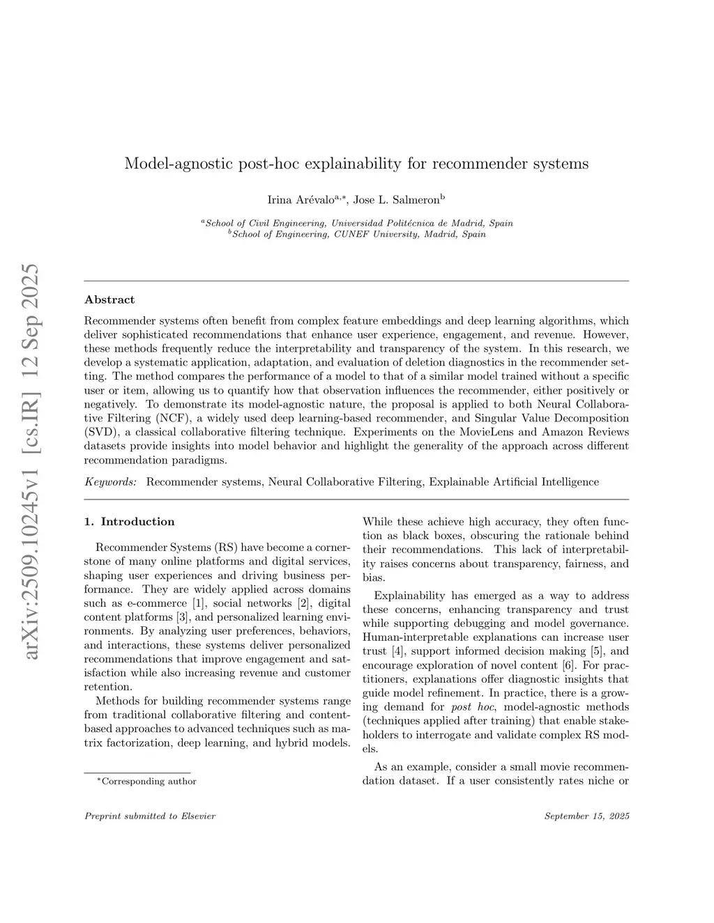 Recommender systems often benefit from complex feature embeddings and deep learning algorithms, which deliver sophisticated recommendations that enhance user experience, engagement, and revenue. However, these methods frequently reduce the interpretability and transparency of the system. In this research, we develop a systematic application, adaptation, and evaluation of deletion diagnostics in the recommender setting. The method compares the performance of a model to that of a similar model trained without a specific user or item, allowing us to quantify how that observation influences the recommender, either positively or negatively. To demonstrate its model-agnostic nature, the proposal is applied to both Neural Collaborative Filtering (NCF), a widely used deep learning-based recommender, and Singular Value Decomposition (SVD), a classical collaborative filtering technique. Experiments on the MovieLens and Amazon Reviews datasets provide insights into model behavior and highlight the generality of the approach across different recommendation paradigms.