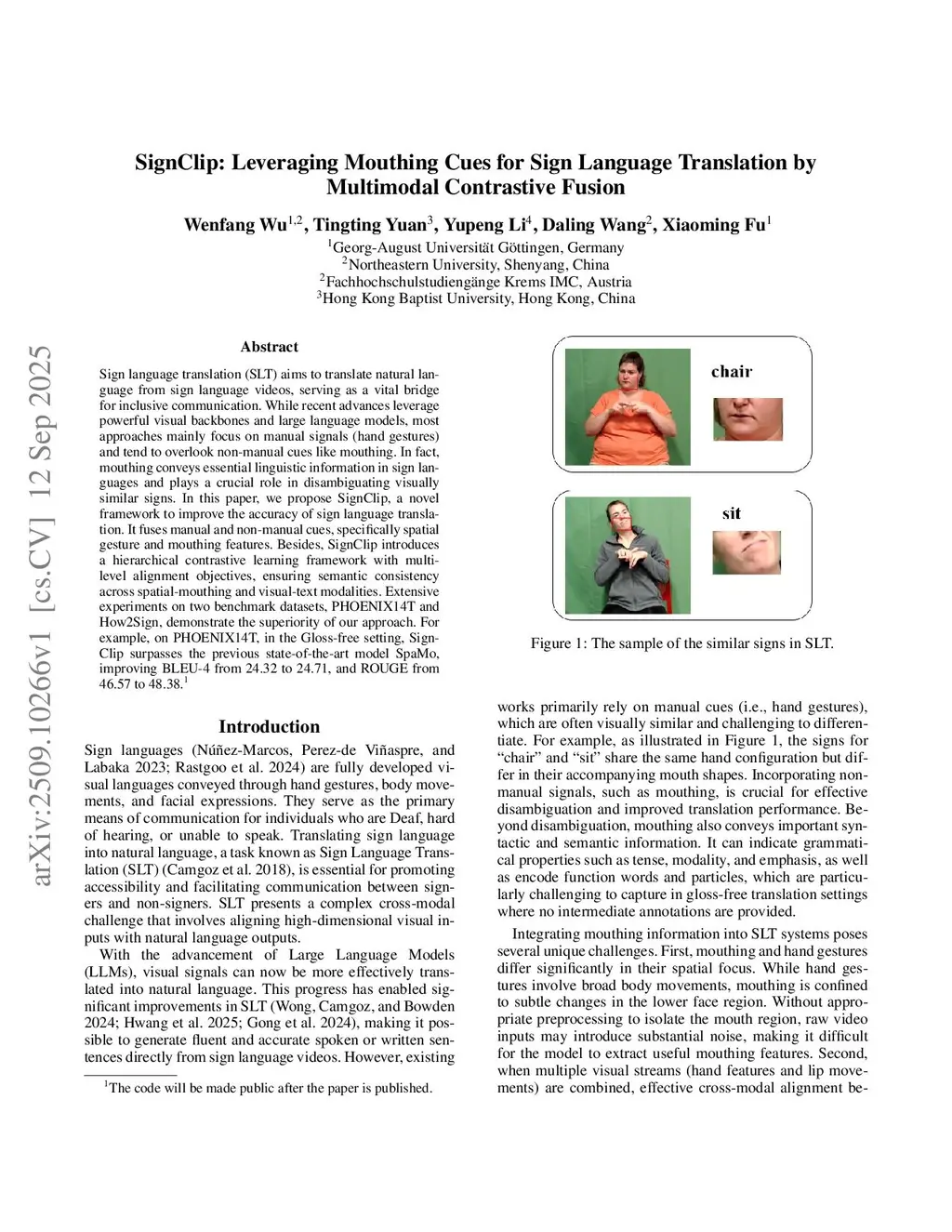 Sign language translation (SLT) aims to translate natural language from sign language videos, serving as a vital bridge for inclusive communication. While recent advances leverage powerful visual backbones and large language models, most approaches mainly focus on manual signals (hand gestures) and tend to overlook non-manual cues like mouthing. In fact, mouthing conveys essential linguistic information in sign languages and plays a crucial role in disambiguating visually similar signs. In this paper, we propose SignClip, a novel framework to improve the accuracy of sign language translation. It fuses manual and non-manual cues, specifically spatial gesture and lip movement features. Besides, SignClip introduces a hierarchical contrastive learning framework with multi-level alignment objectives, ensuring semantic consistency across sign-lip and visual-text modalities. Extensive experiments on two benchmark datasets, PHOENIX14T and How2Sign, demonstrate the superiority of our approach. For example, on PHOENIX14T, in the Gloss-free setting, SignClip surpasses the previous state-of-the-art model SpaMo, improving BLEU-4 from 24.32 to 24.71, and ROUGE from 46.57 to 48.38.