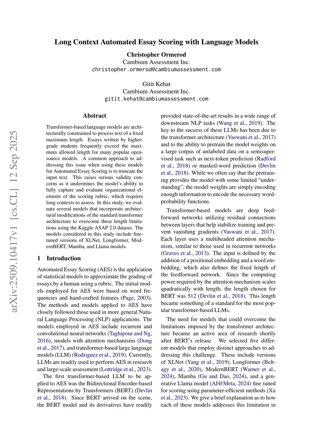 Transformer-based language models are architecturally constrained to process text of a fixed maximum length. Essays written by higher-grade students frequently exceed the maximum allowed length for many popular open-source models. A common approach to addressing this issue when using these models for Automated Essay Scoring is to truncate the input text. This raises serious validity concerns as it undermines the model's ability to fully capture and evaluate organizational elements of the scoring rubric, which requires long contexts to assess. In this study, we evaluate several models that incorporate architectural modifications of the standard transformer architecture to overcome these length limitations using the Kaggle ASAP 2.0 dataset. The models considered in this study include fine-tuned versions of XLNet, Longformer, ModernBERT, Mamba, and Llama models.