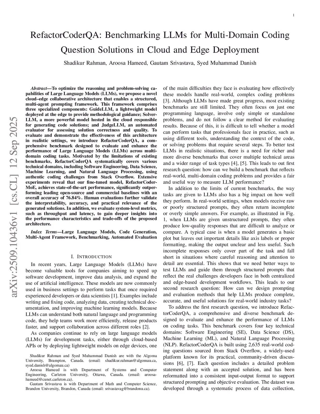To optimize the reasoning and problem-solving capabilities of Large Language Models (LLMs), we propose a novel cloud-edge collaborative architecture that enables a structured multi-agent prompting framework. This framework comprises three specialized components: GuideLLM, a lightweight model deployed at the edge to provide methodological guidance; SolverLLM, a more powerful model hosted in the cloud and responsible for generating code solutions; and JudgeLLM, an automated evaluator for assessing solution correctness and quality. To evaluate and demonstrate the effectiveness of this architecture in realistic settings, we introduce RefactorCoderQA, a comprehensive benchmark designed to evaluate and enhance the performance of LLMs across multi-domain coding tasks. Motivated by the limitations of existing benchmarks, RefactorCoderQA systematically covers multiple technical domains, including Software Engineering, Data Science, Machine Learning, and Natural Language Processing, using authentic coding challenges sourced from Stack Overflow. We propose RefactorCoder-MoE, a fine-tuned mixture-of-experts (MoE) code language model based on DeepSeek-Coder-7B-Instruct, adapted to the RefactorCoderQA benchmark using QLoRA for domain-specific coding question answering. Extensive experiments demonstrate that RefactorCoder-MoE achieves strong and competitive performance, significantly outperforming all evaluated open-source and commercial baselines, with an overall accuracy of 76.84%.