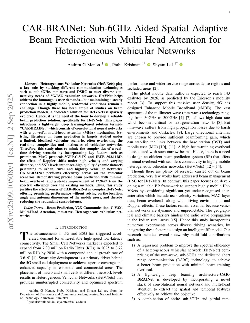 CAR-BRAINet: Sub-6GHz Aided Spatial Adaptive Beam Prediction with Multi Head Attention for Heterogeneous Vehicular Networks