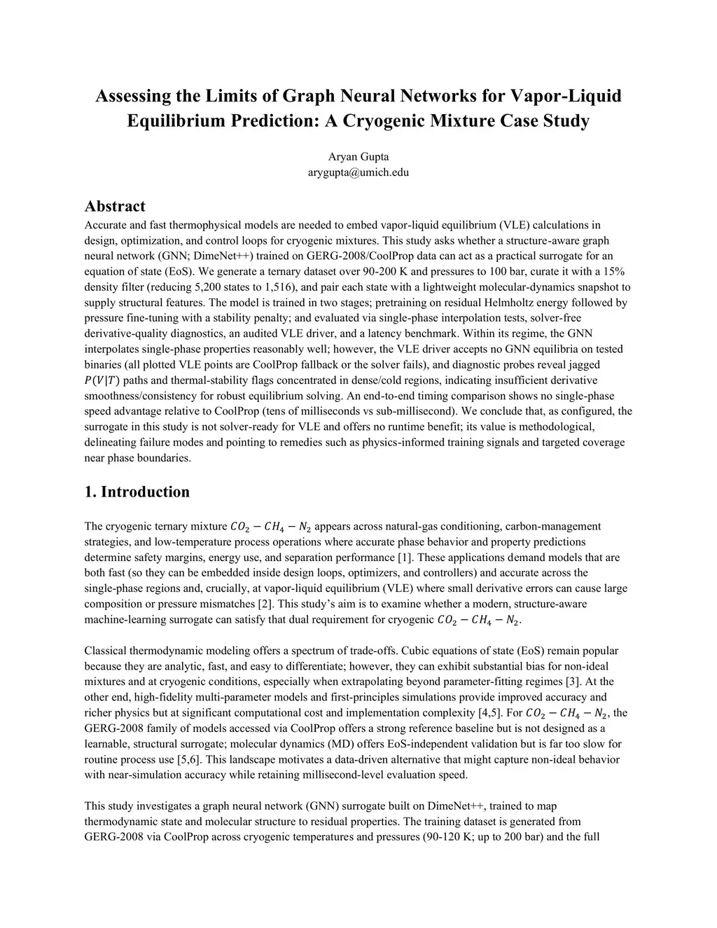 Accurate and fast thermophysical models are needed to embed vapor-liquid equilibrium (VLE) calculations in design, optimization, and control loops for cryogenic mixtures. This study asks whether a structure-aware graph neural network (GNN; DimeNet++) trained on GERG-2008/CoolProp data can act as a practical surrogate for an equation of state (EoS). We generate a ternary dataset over 90-200 K and pressures to 100 bar, curate it with a 15% density filter (reducing 5,200 states to 1,516), and pair each state with a lightweight molecular-dynamics snapshot to supply structural features. The model is trained in two stages; pretraining on residual Helmholtz energy followed by pressure fine-tuning with a stability penalty; and evaluated via single-phase interpolation tests, solver-free derivative-quality diagnostics, an audited VLE driver, and a latency benchmark. Within its regime, the GNN interpolates single-phase properties reasonably well; however, the VLE driver accepts no GNN equilibria on tested binaries (all plotted VLE points are CoolProp fallback or the solver fails), and diagnostic probes reveal jagged P(V|T) paths and thermal-stability flags concentrated in dense/cold regions, indicating insufficient derivative smoothness/consistency for robust equilibrium solving. An end-to-end timing comparison shows no single-phase speed advantage relative to CoolProp (tens of milliseconds vs sub-millisecond). We conclude that, as configured, the surrogate in this study is not solver-ready for VLE and offers no runtime benefit; its value is methodological, delineating failure modes and pointing to remedies such as physics-informed training signals and targeted coverage near phase boundaries.