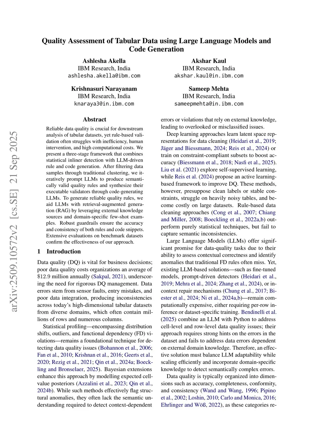 Reliable data quality is crucial for downstream analysis of tabular datasets, yet rule-based validation often struggles with inefficiency, human intervention, and high computational costs. We present a three-stage framework that combines statistical inliner detection with LLM-driven rule and code generation. After filtering data samples through traditional clustering, we iteratively prompt LLMs to produce semantically valid quality rules and synthesize their executable validators through code-generating LLMs. To generate reliable quality rules, we aid LLMs with retrieval-augmented generation (RAG) by leveraging external knowledge sources and domain-specific few-shot examples. Robust guardrails ensure the accuracy and consistency of both rules and code snippets. Extensive evaluations on benchmark datasets confirm the effectiveness of our approach.