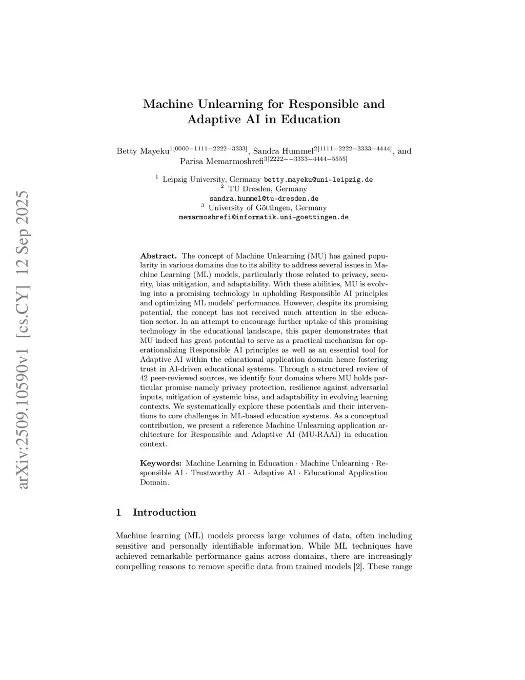 Machine Unlearning for Responsible and Adaptive AI in Education