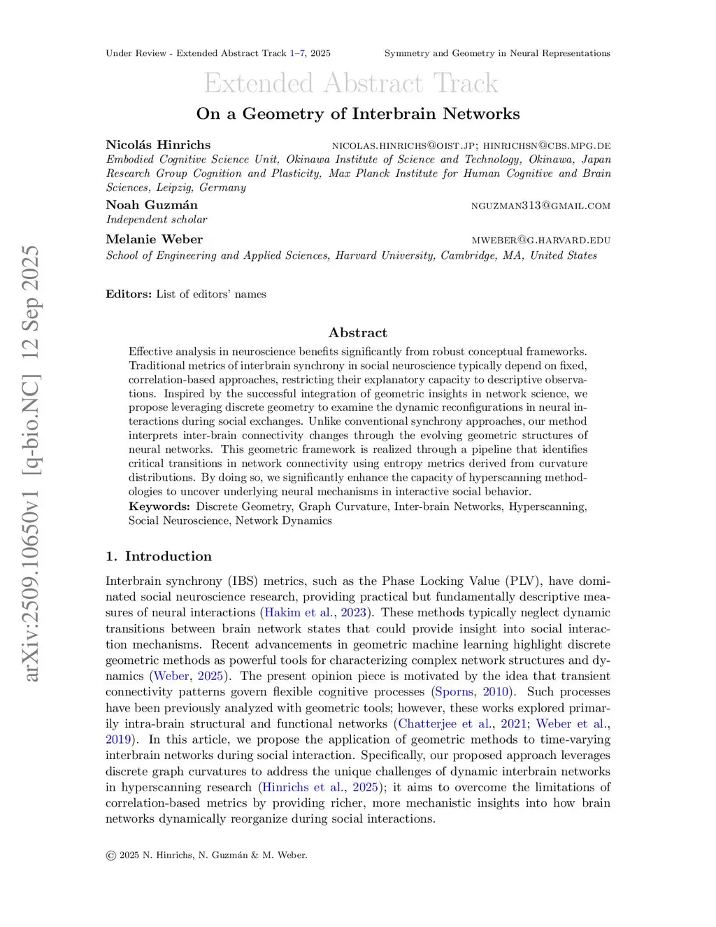 Effective analysis in neuroscience benefits significantly from robust conceptual frameworks. Traditional metrics of interbrain synchrony in social neuroscience typically depend on fixed, correlation-based approaches, restricting their explanatory capacity to descriptive observations. Inspired by the successful integration of geometric insights in network science, we propose leveraging discrete geometry to examine the dynamic reconfigurations in neural interactions during social exchanges. Unlike conventional synchrony approaches, our method interprets inter-brain connectivity changes through the evolving geometric structures of neural networks. This geometric framework is realized through a pipeline that identifies critical transitions in network connectivity using entropy metrics derived from curvature distributions. By doing so, we significantly enhance the capacity of hyperscanning methodologies to uncover underlying neural mechanisms in interactive social behavior.