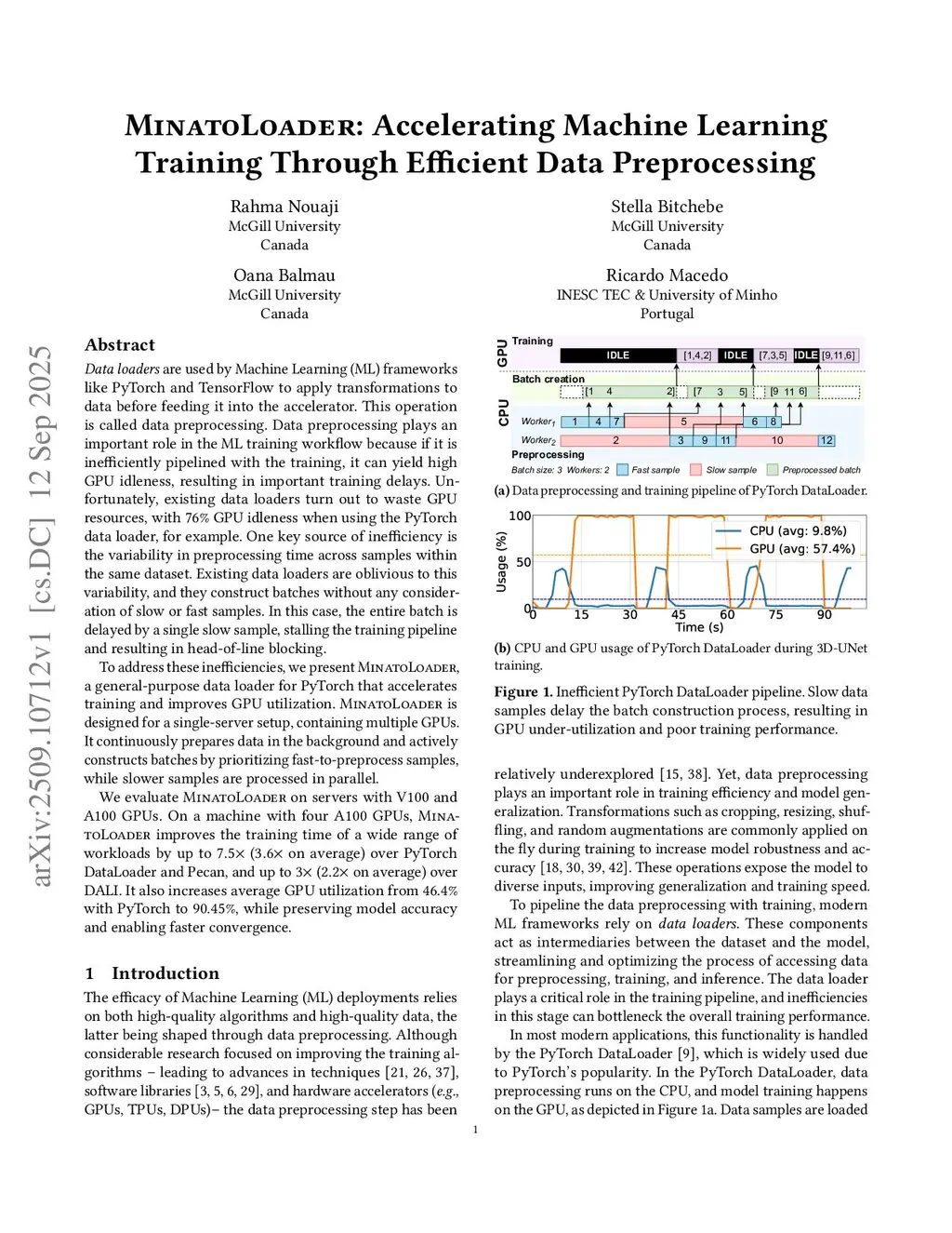 Data loaders are used by Machine Learning (ML) frameworks like PyTorch and TensorFlow to apply transformations to data before feeding it into the accelerator. This operation is called data preprocessing. Data preprocessing plays an important role in the ML training workflow because if it is inefficiently pipelined with the training, it can yield high GPU idleness, resulting in important training delays. Unfortunately, existing data loaders turn out to waste GPU resources, with GPU idleness when using the PyTorch data loader, for example. One key source of inefficiency is the variability in preprocessing time across samples within the same dataset. Existing data loaders are oblivious to this variability, and they construct batches without any consideration of slow or fast samples. In this case, the entire batch is delayed by a single slow sample, stalling the training pipeline and resulting in head-of-line blocking.To address these inefficiencies, we present MinatoLoader, a general-purpose data loader for PyTorch that accelerates training and improves GPU utilization. MinatoLoader is designed for a single-server setup, containing multiple GPUs. It continuously prepares data in the background and actively constructs batches by prioritizing fast-to-preprocess samples, while slower samples are processed in parallel.We evaluate MinatoLoader on servers with V100 and A100 GPUs. On a machine with four A100 GPUs, MinatoLoader improves the training time of a wide range of workloads by up to ( on average) over PyTorch DataLoader and Pecan, and up to ( on average) over DALI. It also increases average GPU utilization from 46.4\% with PyTorch to 90.45\%, while preserving model accuracy and enabling faster convergence.
