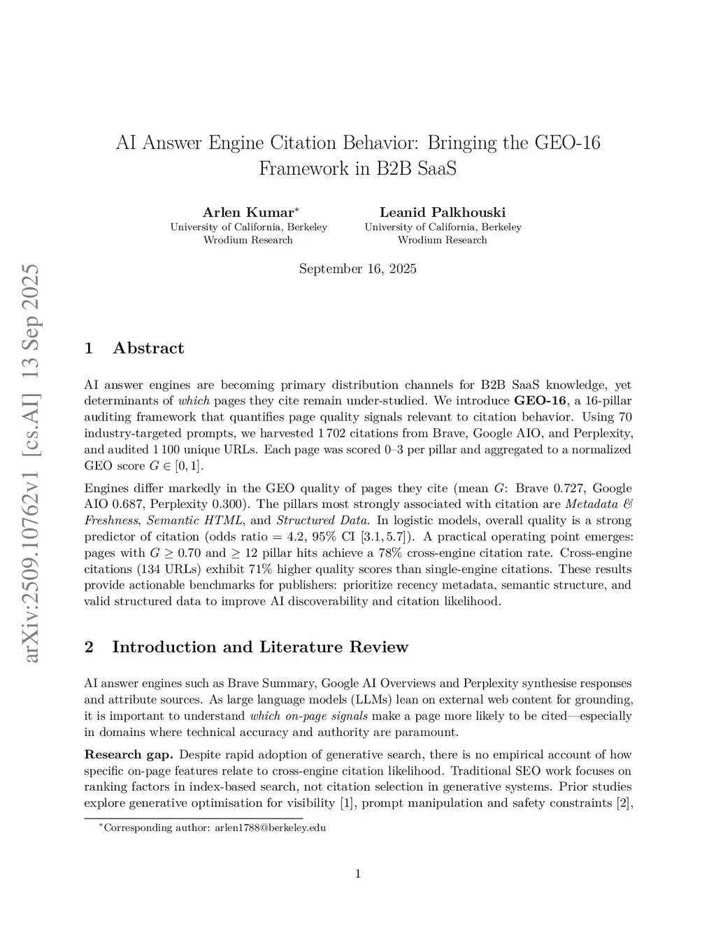 AI answer engines increasingly mediate access to domain knowledge by generating responses and citing web sources. We introduce GEO-16, a 16 pillar auditing framework that converts on page quality signals into banded pillar scores and a normalized GEO score G that ranges from 0 to 1. Using 70 product intent prompts, we collected 1,702 citations across three engines (Brave Summary, Google AI Overviews, and Perplexity) and audited 1,100 unique URLs. In our corpus, the engines differed in the GEO quality of the pages they cited, and pillars related to Metadata and Freshness, Semantic HTML, and Structured Data showed the strongest associations with citation. Logistic models with domain clustered standard errors indicate that overall page quality is a strong predictor of citation, and simple operating points (for example, G at least 0.70 combined with at least 12 pillar hits) align with substantially higher citation rates in our data. We report per engine contrasts, vertical effects, threshold analysis, and diagnostics, then translate findings into a practical playbook for publishers. The study is observational and focuses on English language B2B SaaS pages; we discuss limitations, threats to validity, and reproducibility considerations.