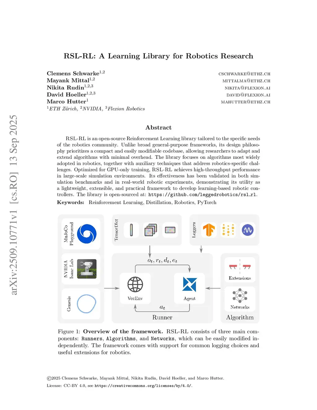RSL-RL is an open-source Reinforcement Learning library tailored to the specific needs of the robotics community. Unlike broad general-purpose frameworks, its design philosophy prioritizes a compact and easily modifiable codebase, allowing researchers to adapt and extend algorithms with minimal overhead. The library focuses on algorithms most widely adopted in robotics, together with auxiliary techniques that address robotics-specific challenges. Optimized for GPU-only training, RSL-RL achieves high-throughput performance in large-scale simulation environments. Its effectiveness has been validated in both simulation benchmarks and in real-world robotic experiments, demonstrating its utility as a lightweight, extensible, and practical framework to develop learning-based robotic controllers. The library is open-sourced at:this https URL.