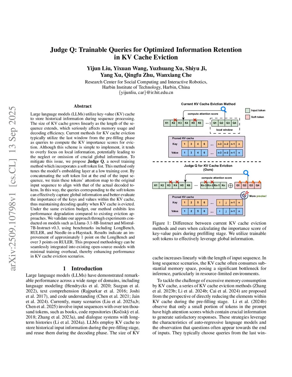 Large language models (LLMs) utilize key-value (KV) cache to store historical information during sequence processing. The size of KV cache grows linearly as the length of the sequence extends, which seriously affects memory usage and decoding efficiency. Current methods for KV cache eviction typically utilize the last window from the pre-filling phase as queries to compute the KV importance scores for eviction. Although this scheme is simple to implement, it tends to overly focus on local information, potentially leading to the neglect or omission of crucial global information. To mitigate this issue, we propose Judge Q, a novel training method which incorporates a soft token list. This method only tunes the model's embedding layer at a low training cost. By concatenating the soft token list at the end of the input sequence, we train these tokens' attention map to the original input sequence to align with that of the actual decoded tokens. In this way, the queries corresponding to the soft tokens can effectively capture global information and better evaluate the importance of the keys and values within the KV cache, thus maintaining decoding quality when KV cache is evicted. Under the same eviction budget, our method exhibits less performance degradation compared to existing eviction approaches. We validate our approach through experiments conducted on models such as Llama-3.1-8B-Instruct and Mistral-7B-Instruct-v0.3, using benchmarks including LongBench, RULER, and Needle-in-a-Haystack. Results indicate an improvement of approximately 1 point on the LongBench and over 3 points on RULER. This proposed methodology can be seamlessly integrated into existing open-source models with minimal training overhead, thereby enhancing performance in KV cache eviction scenarios.