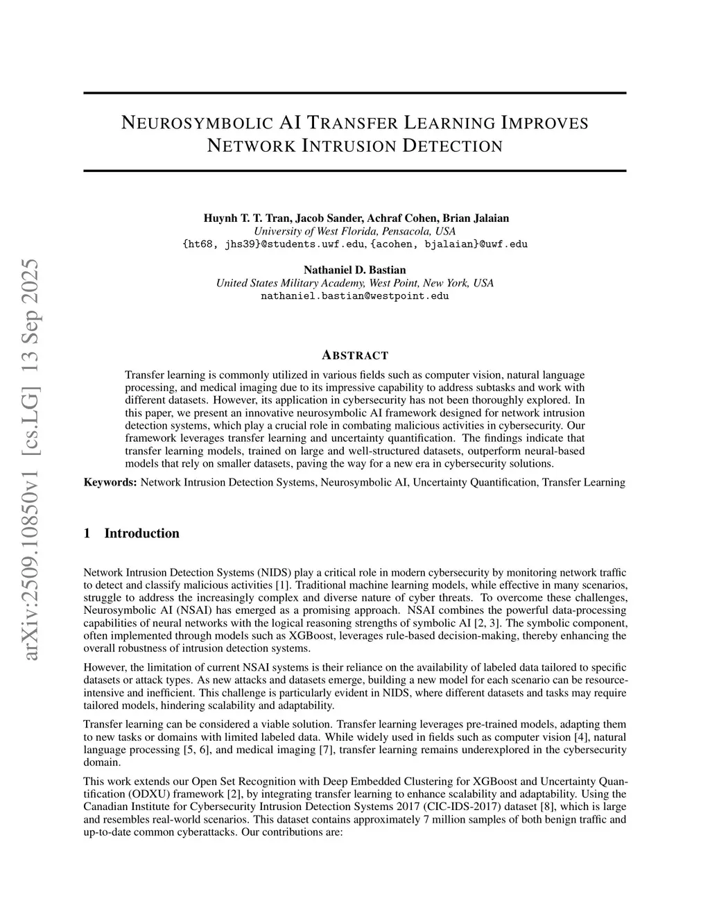 Transfer learning is commonly utilized in various fields such as computer vision, natural language processing, and medical imaging due to its impressive capability to address subtasks and work with different datasets. However, its application in cybersecurity has not been thoroughly explored. In this paper, we present an innovative neurosymbolic AI framework designed for network intrusion detection systems, which play a crucial role in combating malicious activities in cybersecurity. Our framework leverages transfer learning and uncertainty quantification. The findings indicate that transfer learning models, trained on large and well-structured datasets, outperform neural-based models that rely on smaller datasets, paving the way for a new era in cybersecurity solutions.