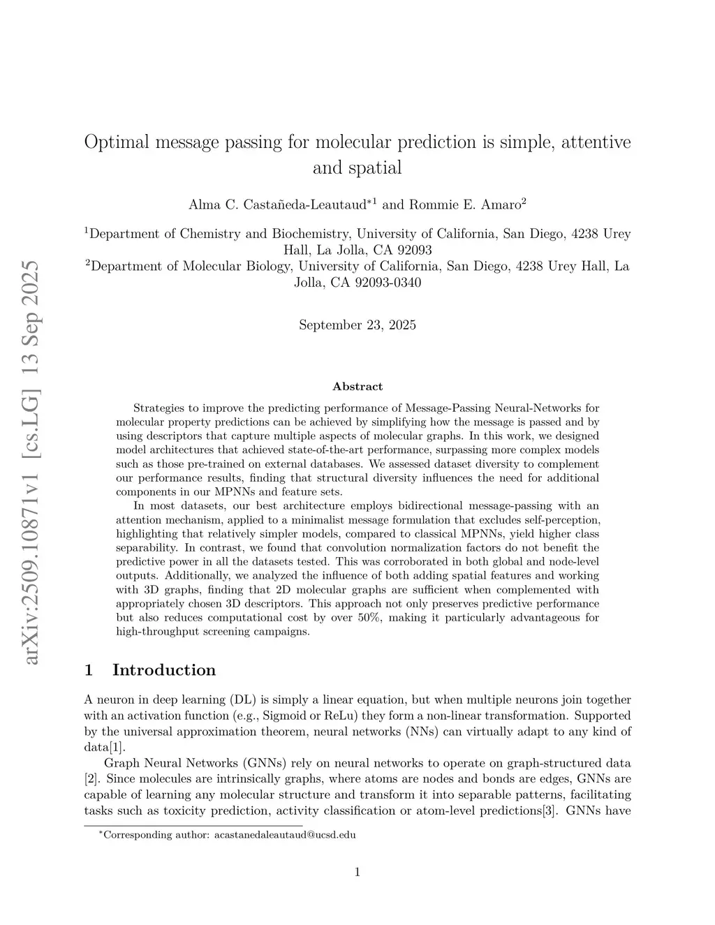 Strategies to improve the predicting performance of Message-Passing Neural-Networks for molecular property predictions can be achieved by simplifying how the message is passed and by using descriptors that capture multiple aspects of molecular graphs. In this work, we designed model architectures that achieved state-of-the-art performance, surpassing more complex models such as those pre-trained on external databases. We assessed dataset diversity to complement our performance results, finding that structural diversity influences the need for additional components in our MPNNs and feature sets.In most datasets, our best architecture employs bidirectional message-passing with an attention mechanism, applied to a minimalist message formulation that excludes self-perception, highlighting that relatively simpler models, compared to classical MPNNs, yield higher class separability. In contrast, we found that convolution normalization factors do not benefit the predictive power in all the datasets tested. This was corroborated in both global and node-level outputs. Additionally, we analyzed the influence of both adding spatial features and working with 3D graphs, finding that 2D molecular graphs are sufficient when complemented with appropriately chosen 3D descriptors. This approach not only preserves predictive performance but also reduces computational cost by over 50%, making it particularly advantageous for high-throughput screening campaigns.