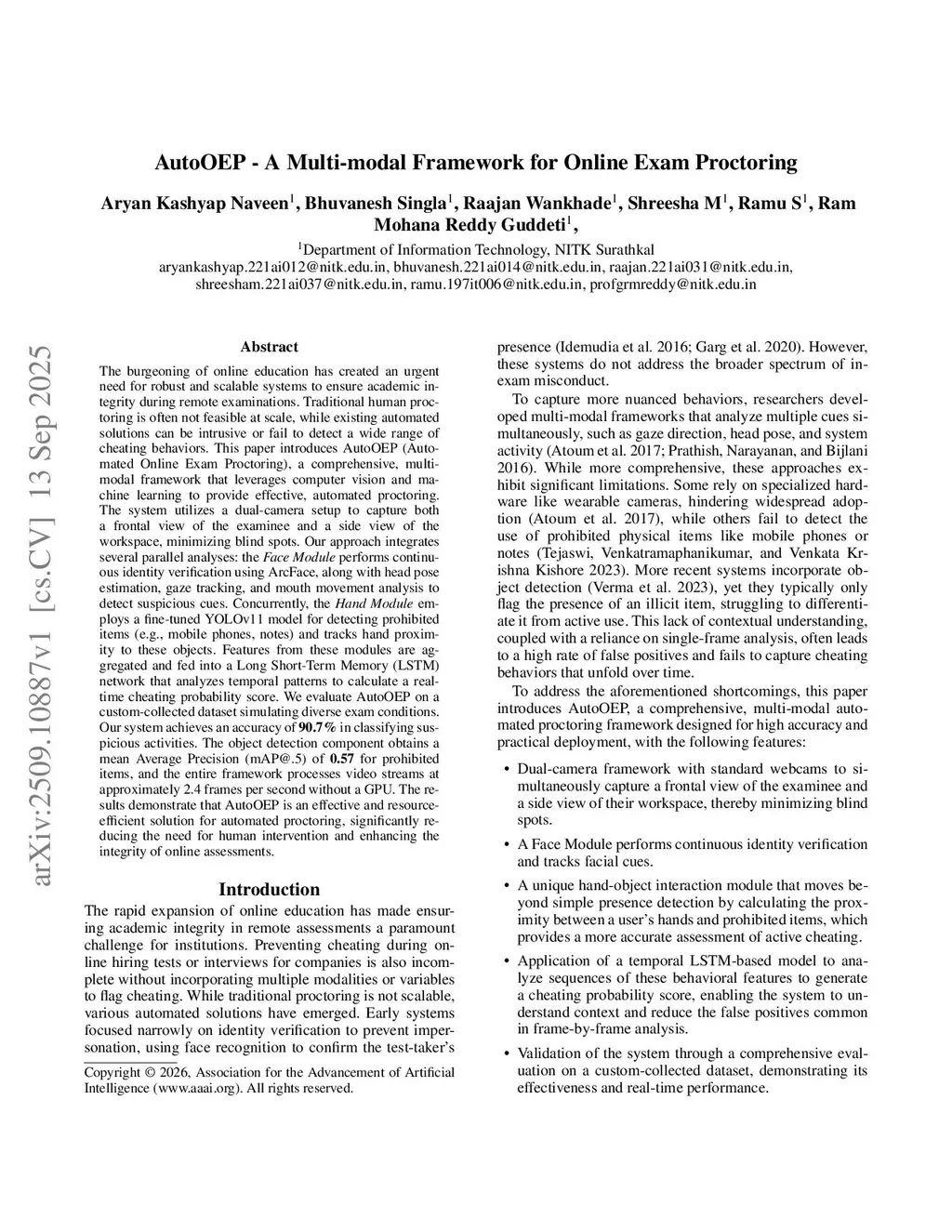 The burgeoning of online education has created an urgent need for robust and scalable systems to ensure academic integrity during remote examinations. Traditional human proctoring is often not feasible at scale, while existing automated solutions can be intrusive or fail to detect a wide range of cheating behaviors. This paper introduces AutoOEP (Automated Online Exam Proctoring), a comprehensive, multi-modal framework that leverages computer vision and machine learning to provide effective, automated proctoring. The system utilizes a dual-camera setup to capture both a frontal view of the examinee and a side view of the workspace, minimizing blind spots. Our approach integrates several parallel analyses: the Face Module performs continuous identity verification using ArcFace, along with head pose estimation, gaze tracking, and mouth movement analysis to detect suspicious cues. Concurrently, the Hand Module employs a fine-tuned YOLOv11 model for detecting prohibited items (e.g., mobile phones, notes) and tracks hand proximity to these objects. Features from these modules are aggregated and fed into a Long Short-Term Memory (LSTM) network that analyzes temporal patterns to calculate a real-time cheating probability score. We evaluate AutoOEP on a custom-collected dataset simulating diverse exam conditions. Our system achieves an accuracy of 90.7% in classifying suspicious activities. The object detection component obtains a mean Average Precision (mAP@.5) of 0.57 for prohibited items, and the entire framework processes video streams at approximately 2.4 frames per second without a GPU. The results demonstrate that AutoOEP is an effective and resource-efficient solution for automated proctoring, significantly reducing the need for human intervention and enhancing the integrity of online assessments. The code is public and can be accessed atthis https URL.