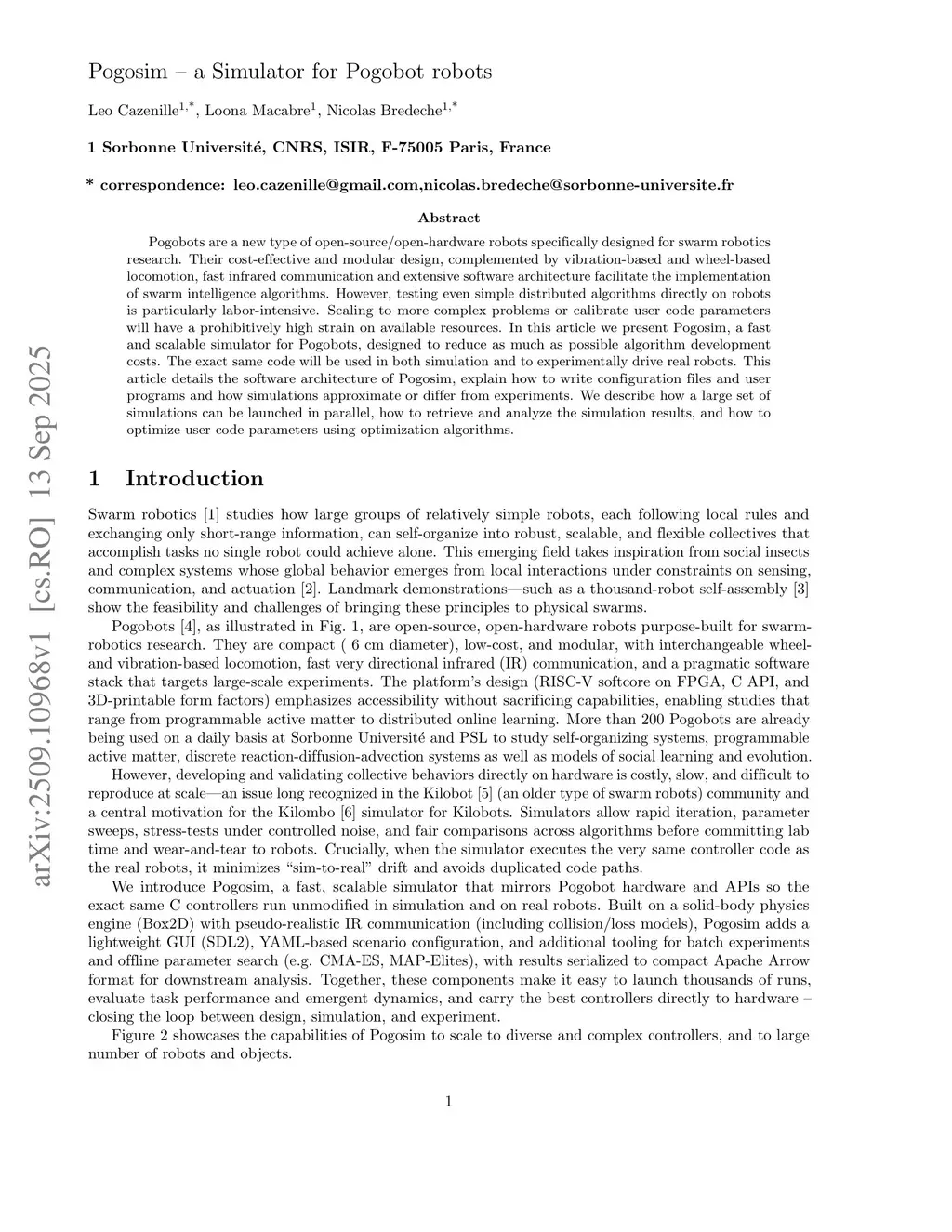 Pogobots are a new type of open-source/open-hardware robots specifically designed for swarm robotics research. Their cost-effective and modular design, complemented by vibration-based and wheel-based locomotion, fast infrared communication and extensive software architecture facilitate the implementation of swarm intelligence algorithms. However, testing even simple distributed algorithms directly on robots is particularly labor-intensive. Scaling to more complex problems or calibrate user code parameters will have a prohibitively high strain on available resources. In this article we present Pogosim, a fast and scalable simulator for Pogobots, designed to reduce as much as possible algorithm development costs. The exact same code will be used in both simulation and to experimentally drive real robots. This article details the software architecture of Pogosim, explain how to write configuration files and user programs and how simulations approximate or differ from experiments. We describe how a large set of simulations can be launched in parallel, how to retrieve and analyze the simulation results, and how to optimize user code parameters using optimization algorithms.