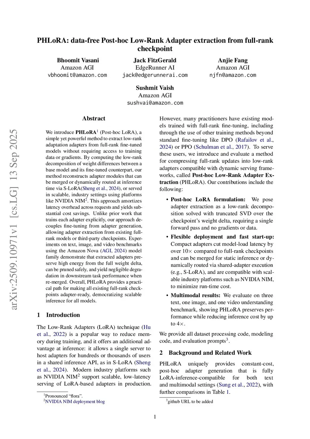 We introduce PHLoRA (Pronounced "flora"). (Post-hoc LoRA), a simple yet powerful method to extract low-rank adaptation adapters from full-rank fine-tuned models without requiring access to training data or gradients. By computing the low-rank decomposition of weight differences between a base model and its fine-tuned counterpart, our method reconstructs adapter modules that can be merged or dynamically routed at inference time via S-LoRA, or served in scalable, industry settings using platforms like NVIDIA NIM. This approach amortizes latency overhead across requests and yields substantial cost savings. Unlike prior work that trains each adapter explicitly, our approach decouples fine-tuning from adapter generation, allowing adapter extraction from existing full-rank models or third-party checkpoints. Experiments on text, image, and video benchmarks using the Amazon Nova model family demonstrate that extracted adapters preserve high energy from the full weight delta, can be pruned safely, and yield negligible degradation in downstream task performance when re-merged. Overall, PHLoRA provides a practical path for making all existing full-rank checkpoints adapter-ready, democratizing scalable inference for all models.