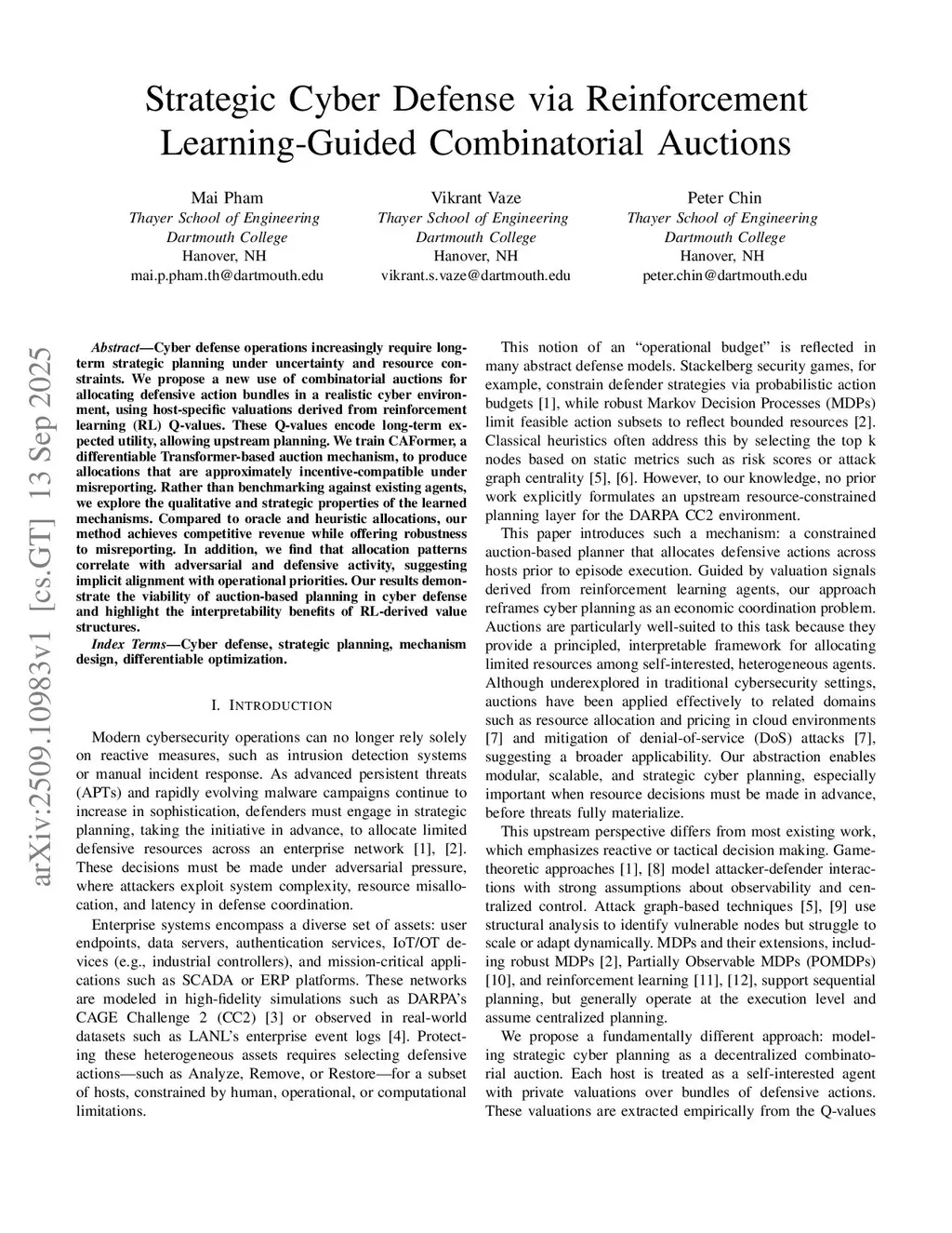 Cyber defense operations increasingly require long-term strategic planning under uncertainty and resource constraints. We propose a new use of combinatorial auctions for allocating defensive action bundles in a realistic cyber environment, using host-specific valuations derived from reinforcement learning (RL) Q-values. These Q-values encode long-term expected utility, allowing upstream planning. We train CAFormer, a differentiable Transformer-based auction mechanism, to produce allocations that are approximately incentive-compatible under misreporting. Rather than benchmarking against existing agents, we explore the qualitative and strategic properties of the learned mechanisms. Compared to oracle and heuristic allocations, our method achieves competitive revenue while offering robustness to misreporting. In addition, we find that allocation patterns correlate with adversarial and defensive activity, suggesting implicit alignment with operational priorities. Our results demonstrate the viability of auction-based planning in cyber defense and highlight the interpretability benefits of RL-derived value structures.