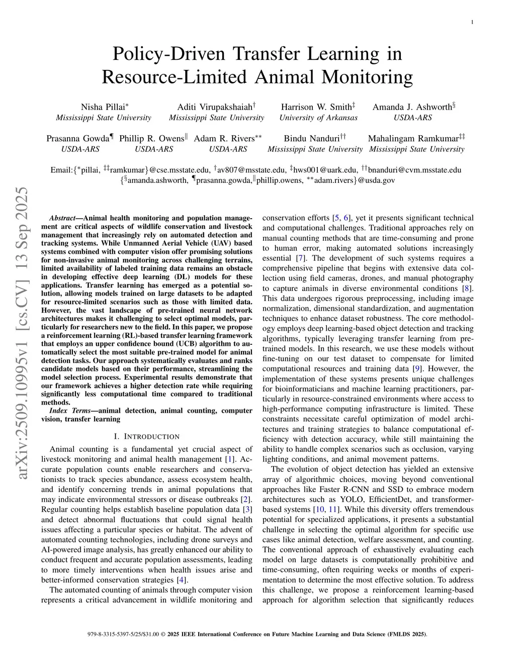 Animal health monitoring and population management are critical aspects of wildlife conservation and livestock management that increasingly rely on automated detection and tracking systems. While Unmanned Aerial Vehicle (UAV) based systems combined with computer vision offer promising solutions for non-invasive animal monitoring across challenging terrains, limited availability of labeled training data remains an obstacle in developing effective deep learning (DL) models for these applications. Transfer learning has emerged as a potential solution, allowing models trained on large datasets to be adapted for resource-limited scenarios such as those with limited data. However, the vast landscape of pre-trained neural network architectures makes it challenging to select optimal models, particularly for researchers new to the field. In this paper, we propose a reinforcement learning (RL)-based transfer learning framework that employs an upper confidence bound (UCB) algorithm to automatically select the most suitable pre-trained model for animal detection tasks. Our approach systematically evaluates and ranks candidate models based on their performance, streamlining the model selection process. Experimental results demonstrate that our framework achieves a higher detection rate while requiring significantly less computational time compared to traditional methods.