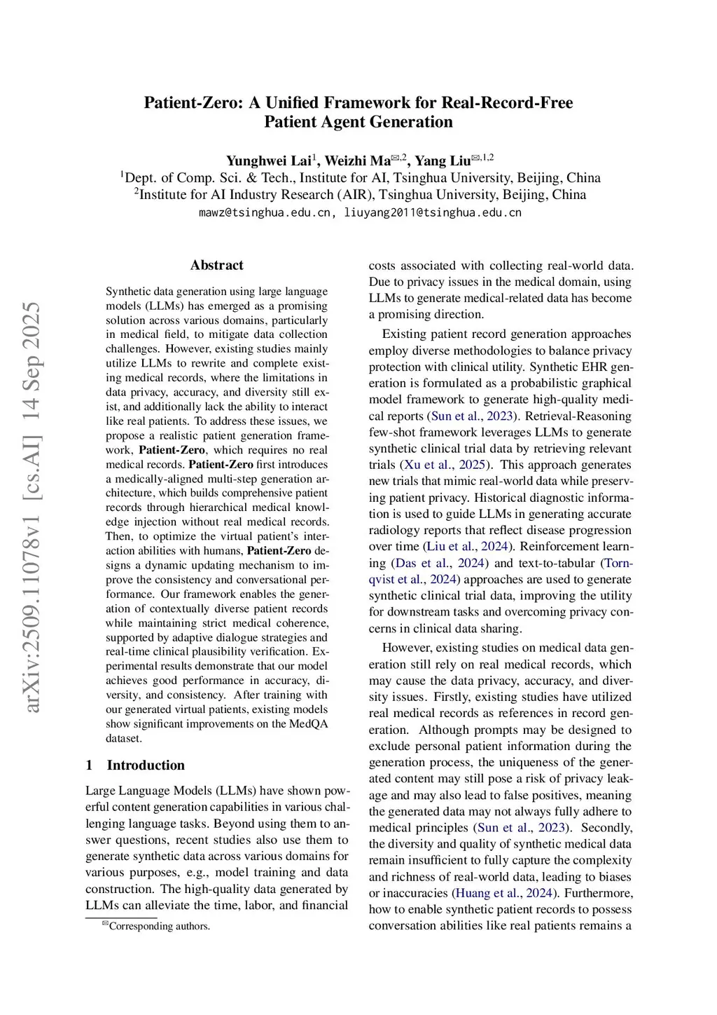 Synthetic data generation with Large Language Models (LLMs) has emerged as a promising solution in the medical domain to mitigate data scarcity and privacy constraints. However, existing approaches remain constrained by their derivative nature, relying on real-world records, which pose privacy risks and distribution biases. Furthermore, current patient agents face the Stability-Plasticity Dilemma, struggling to maintain clinical consistency during dynamic inquiries. To address these challenges, we introduce Patient-Zero, a novel framework for ab initio patient simulation that requires no real medical records. Our Medically-Aligned Hierarchical Synthesis framework generates comprehensive and diverse patient records from abstract clinical guidelines via stratified attribute permutation. To support rigorous clinical interaction, we design a Dual-Track Cognitive Memory System to enable agents dynamically update memory while preserving logical consistency and persona adherence. Extensive evaluations show that Patient-Zero establishes a new state-of-the-art in both data quality and interaction fidelity. In human expert evaluations, senior licensed physicians judge our synthetic data to be statistically indistinguishable from real human-authored data and higher in clinical quality. Furthermore, downstream medical reasoning model trained on our synthetic dataset shows substantial performance gains (MedQA +24.0%; MMLU +14.5%), demonstrating the practical utility of our framework.