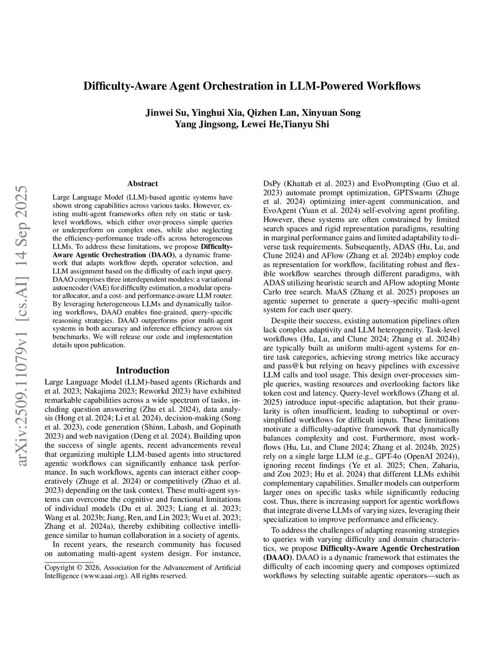 Large Language Model (LLM)-based agentic systems have shown strong capabilities across various tasks. However, existing multi-agent frameworks often rely on static or task-level workflows, which either over-process simple queries or underperform on complex ones, while also neglecting the efficiency-performance trade-offs across heterogeneous LLMs. To address these limitations, we propose Difficulty-Aware Agentic Orchestration (DAAO), which can dynamically generate query-specific multi-agent workflows guided by predicted query difficulty. DAAO comprises three interdependent modules: a variational autoencoder (VAE) for difficulty estimation, a modular operator allocator, and a cost- and performance-aware LLM router. A self-adjusting policy updates difficulty estimates based on workflow success, enabling simpler workflows for easy queries and more complex strategies for harder ones. Experiments on six benchmarks demonstrate that DAAO surpasses prior multi-agent systems in both accuracy and inference efficiency, validating its effectiveness for adaptive, difficulty-aware reasoning.
