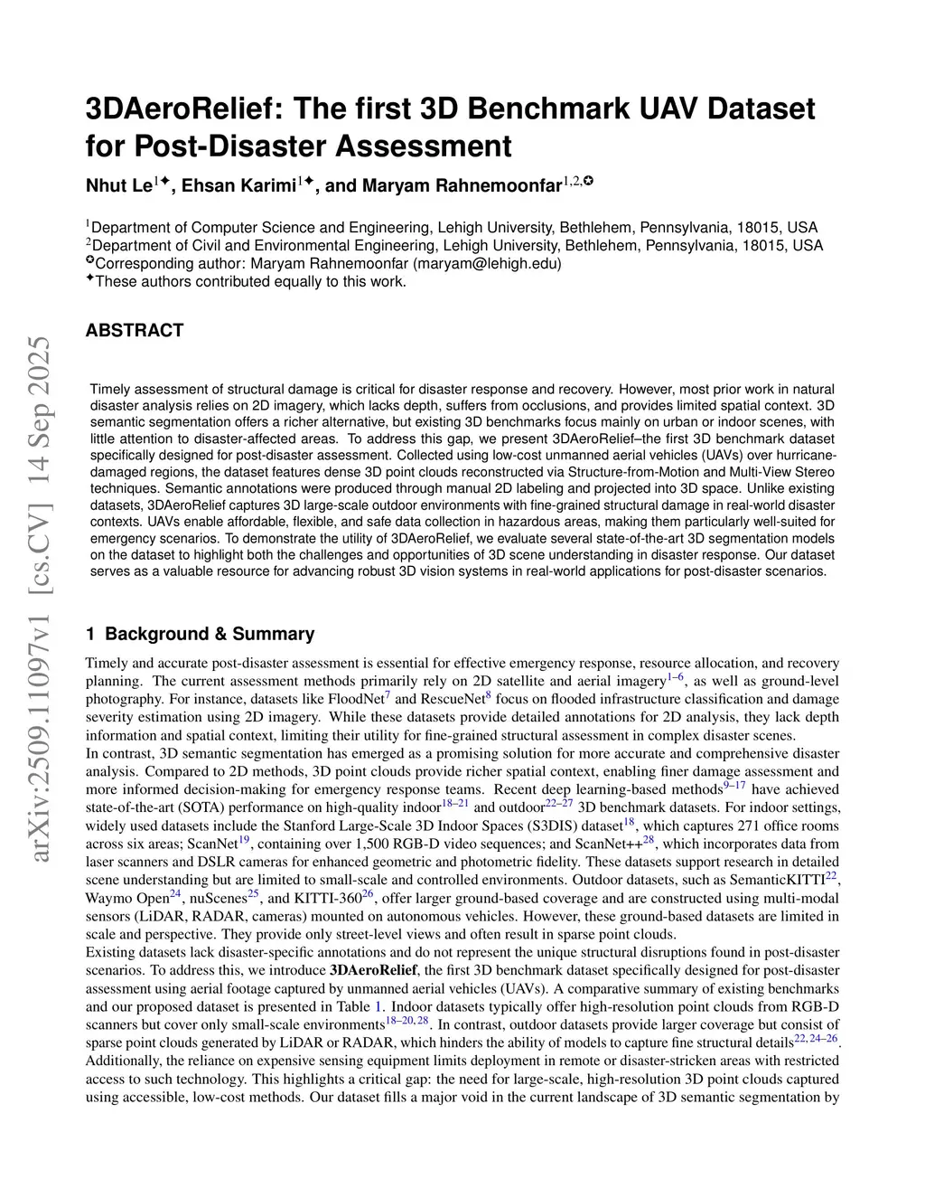 3DAeroRelief: The first 3D Benchmark UAV Dataset for Post-Disaster Assessment