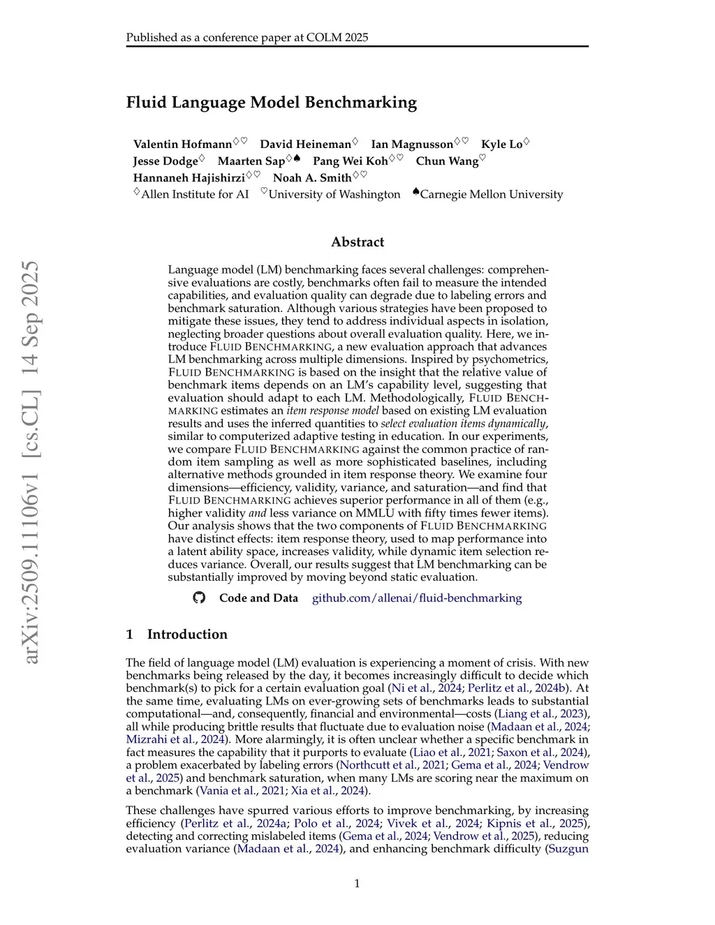 Language model (LM) benchmarking faces several challenges: comprehensive evaluations are costly, benchmarks often fail to measure the intended capabilities, and evaluation quality can degrade due to labeling errors and benchmark saturation. Although various strategies have been proposed to mitigate these issues, they tend to address individual aspects in isolation, neglecting broader questions about overall evaluation quality. Here, we introduce Fluid Benchmarking, a new evaluation approach that advances LM benchmarking across multiple dimensions. Inspired by psychometrics, Fluid Benchmarking is based on the insight that the relative value of benchmark items depends on an LM's capability level, suggesting that evaluation should adapt to each LM. Methodologically, Fluid Benchmarking estimates an item response model based on existing LM evaluation results and uses the inferred quantities to select evaluation items dynamically, similar to computerized adaptive testing in education. In our experiments, we compare Fluid Benchmarking against the common practice of random item sampling as well as more sophisticated baselines, including alternative methods grounded in item response theory. We examine four dimensions -- efficiency, validity, variance, and saturation -- and find that Fluid Benchmarking achieves superior performance in all of them (e.g., higher validity and less variance on MMLU with fifty times fewer items). Our analysis shows that the two components of Fluid Benchmarking have distinct effects: item response theory, used to map performance into a latent ability space, increases validity, while dynamic item selection reduces variance. Overall, our results suggest that LM benchmarking can be substantially improved by moving beyond static evaluation.