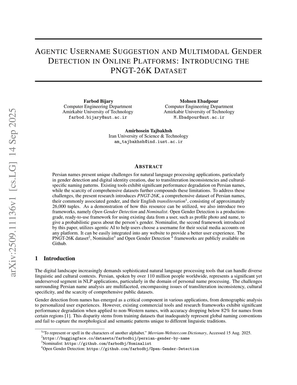 Persian names present unique challenges for natural language processing applications, particularly in gender detection and digital identity creation, due to transliteration inconsistencies and cultural- specific naming patterns. Existing tools exhibit significant performance degradation on Persian names, while the scarcity of comprehensive datasets further compounds these limitations. To address these challenges, the present research introduces PNGT-26K, a comprehensive dataset of Persian names, their commonly associated gender, and their English transliteration, consisting of approximately 26,000 tuples. As a demonstration of how this resource can be utilized, we also introduce two frameworks, namely Open Gender Detection and Nominalist. Open Gender Detection is a production- grade, ready-to-use framework for using existing data from a user, such as profile photo and name, to give a probabilistic guess about the person's gender. Nominalist, the second framework introduced by this paper, utilizes agentic AI to help users choose a username for their social media accounts on any platform. It can be easily integrated into any website to provide a better user experience. The PNGT-26K dataset, Nominalist and Open Gender Detection frameworks are publicly available on Github.