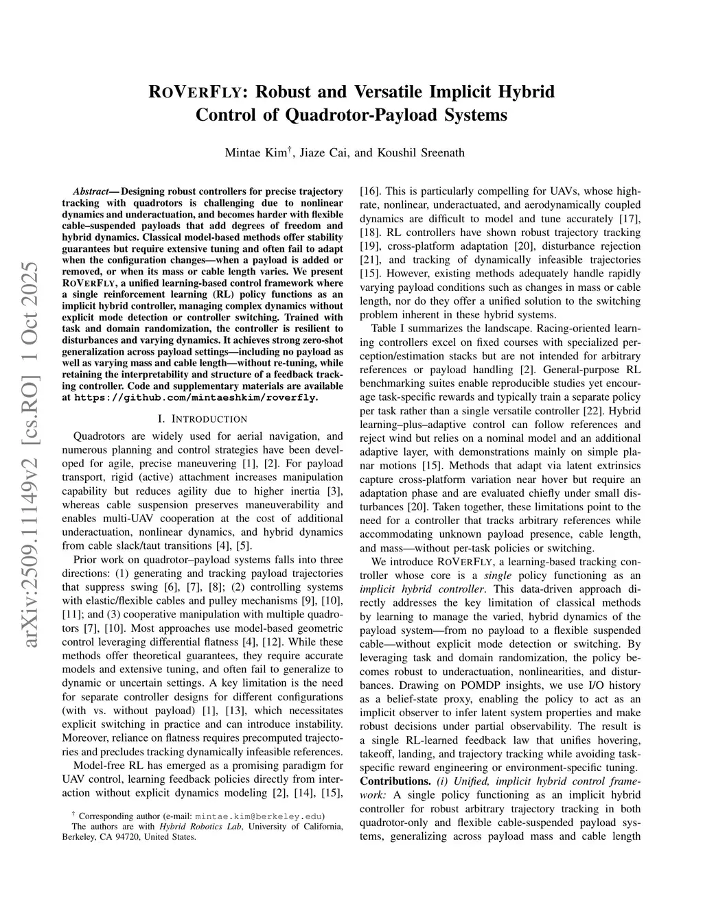 Designing robust controllers for precise trajectory tracking with quadrotors is challenging due to nonlinear dynamics and underactuation, and becomes harder with flexible cable-suspended payloads that add degrees of freedom and hybrid dynamics. Classical model-based methods offer stability guarantees but require extensive tuning and often fail to adapt when the configuration changes-when a payload is added or removed, or when its mass or cable length varies. We present RoVerFly, a unified learning-based control framework where a single reinforcement learning (RL) policy functions as an implicit hybrid controller, managing complex dynamics without explicit mode detection or controller switching. Trained with task and domain randomization, the controller is resilient to disturbances and varying dynamics. It achieves strong zero-shot generalization across payload settings-including no payload as well as varying mass and cable length-without re-tuning, while retaining the interpretability and structure of a feedback tracking controller. Code and supplementary materials are available atthis https URL.