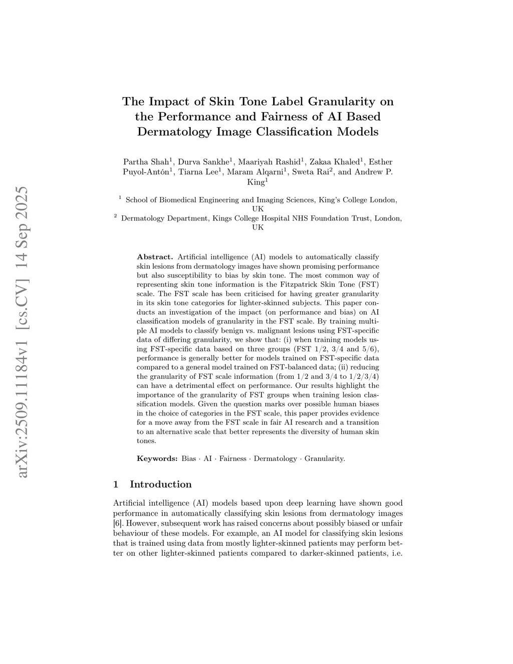Artificial intelligence (AI) models to automatically classify skin lesions from dermatology images have shown promising performance but also susceptibility to bias by skin tone. The most common way of representing skin tone information is the Fitzpatrick Skin Tone (FST) scale. The FST scale has been criticised for having greater granularity in its skin tone categories for lighter-skinned subjects. This paper conducts an investigation of the impact (on performance and bias) on AI classification models of granularity in the FST scale. By training multiple AI models to classify benign vs. malignant lesions using FST-specific data of differing granularity, we show that: (i) when training models using FST-specific data based on three groups (FST 1/2, 3/4 and 5/6), performance is generally better for models trained on FST-specific data compared to a general model trained on FST-balanced data; (ii) reducing the granularity of FST scale information (from 1/2 and 3/4 to 1/2/3/4) can have a detrimental effect on performance. Our results highlight the importance of the granularity of FST groups when training lesion classification models. Given the question marks over possible human biases in the choice of categories in the FST scale, this paper provides evidence for a move away from the FST scale in fair AI research and a transition to an alternative scale that better represents the diversity of human skin tones.