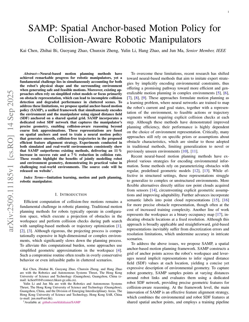 Neural-based motion planning methods have achieved remarkable progress for robotic manipulators, yet a fundamental challenge lies in simultaneously accounting for both the robot's physical shape and the surrounding environment when generating safe and feasible motions. Moreover, existing approaches often rely on simplified robot models or focus primarily on obstacle representation, which can lead to incomplete collision detection and degraded performance in cluttered scenes. To address these limitations, we propose spatial anchor-based motion policy (SAMP), a unified framework that simultaneously encodes the environment and the manipulator using signed distance field (SDF) anchored on a shared spatial grid. SAMP incorporates a dedicated robot SDF network that captures the manipulator's precise geometry, enabling collision-aware reasoning beyond coarse link approximations. These representations are fused on spatial anchors and used to train a neural motion policy that generates smooth, collision-free trajectories in the proposed efficient feature alignment strategy. Experiments conducted in both simulated and real-world environments consistently show that SAMP outperforms existing methods, delivering an 11% increase in success rate and a 7% reduction in collision rate. These results highlight the benefits of jointly modelling robot and environment geometry, demonstrating its practical value in challenging real-world environments.