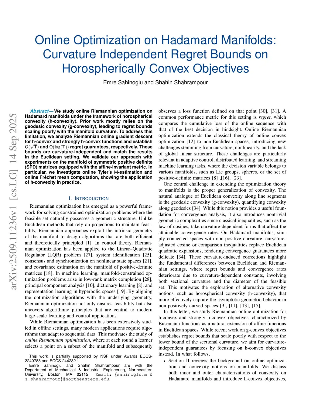 We study online Riemannian optimization on Hadamard manifolds under the framework of horospherical convexity (h-convexity). Prior work mostly relies on the geodesic convexity (g-convexity), leading to regret bounds scaling poorly with the manifold curvature. To address this limitation, we analyze Riemannian online gradient descent for h-convex and strongly h-convex functions and establish and regret guarantees, respectively. These bounds are curvature-independent and match the results in the Euclidean setting. We validate our approach with experiments on the manifold of symmetric positive definite (SPD) matrices equipped with the affine-invariant metric. In particular, we investigate online Tyler's -estimation and online Fréchet mean computation, showing the application of h-convexity in practice.