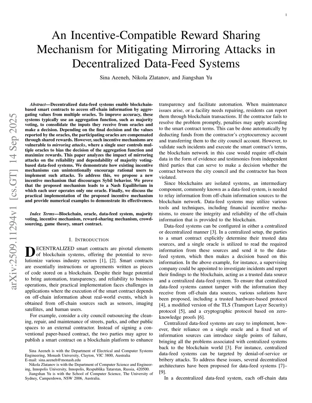 Decentralized data-feed systems enable blockchain-based smart contracts to access off-chain information by aggregating values from multiple oracles. To improve accuracy, these systems typically use an aggregation function, such as majority voting, to consolidate the inputs they receive from oracles and make a decision. Depending on the final decision and the values reported by the oracles, the participating oracles are compensated through shared rewards. However, such incentive mechanisms are vulnerable to mirroring attacks, where a single user controls multiple oracles to bias the decision of the aggregation function and maximize rewards. This paper analyzes the impact of mirroring attacks on the reliability and dependability of majority voting-based data-feed systems. We demonstrate how existing incentive mechanisms can unintentionally encourage rational users to implement such attacks. To address this, we propose a new incentive mechanism that discourages Sybil behavior. We prove that the proposed mechanism leads to a Nash Equilibrium in which each user operates only one oracle. Finally, we discuss the practical implementation of the proposed incentive mechanism and provide numerical examples to demonstrate its effectiveness.