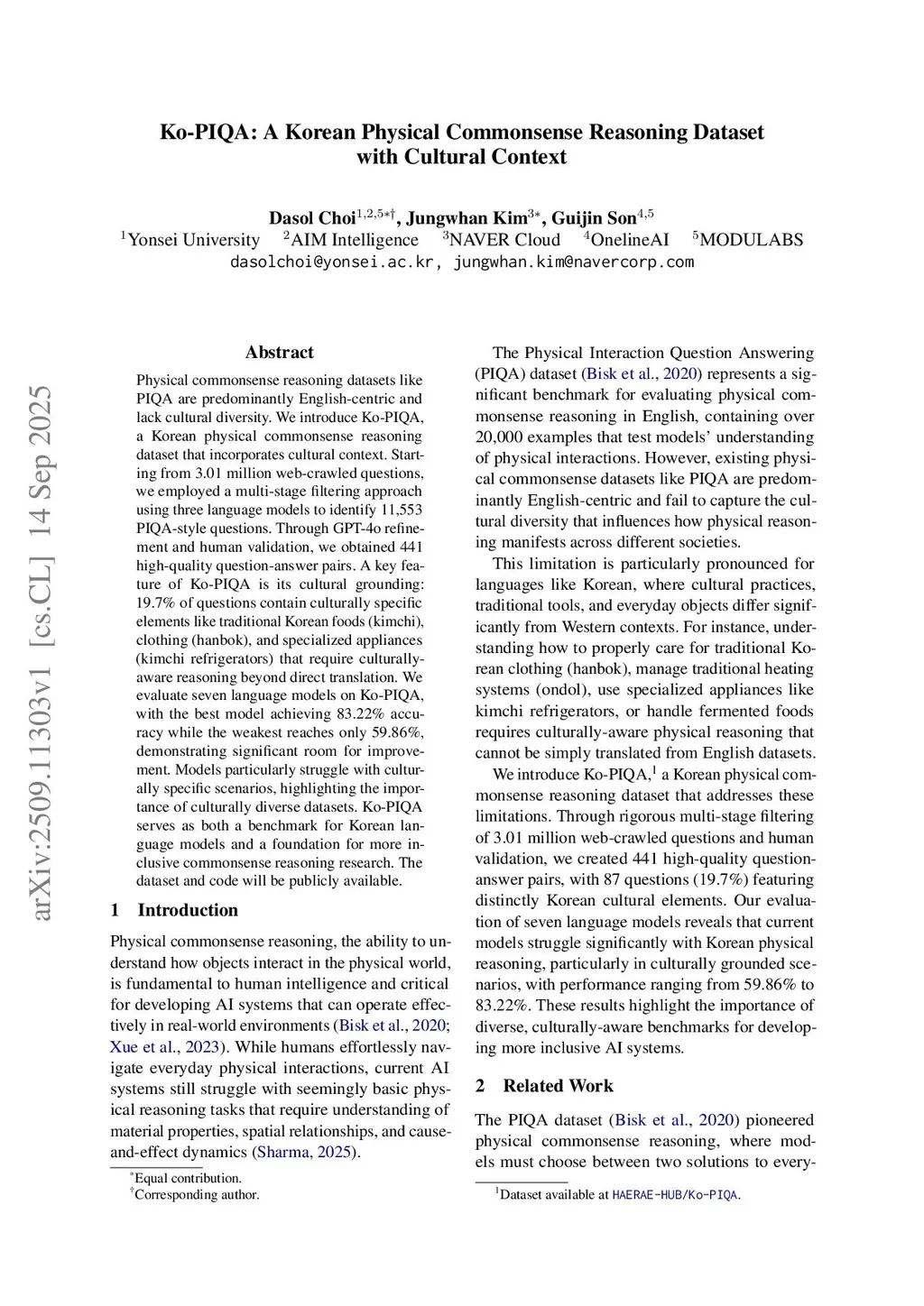 Physical commonsense reasoning datasets like PIQA are predominantly English-centric and lack cultural diversity. We introduce Ko-PIQA, a Korean physical commonsense reasoning dataset that incorporates cultural context. Starting from 3.01 million web-crawled questions, we employed a multi-stage filtering approach using three language models to identify 11,553 PIQA-style questions. Through GPT-4o refinement and human validation, we obtained 441 high-quality question-answer pairs. A key feature of Ko-PIQA is its cultural grounding: 19.7\% of questions contain culturally specific elements like traditional Korean foods (kimchi), clothing (hanbok), and specialized appliances (kimchi refrigerators) that require culturally-aware reasoning beyond direct translation. We evaluate seven language models on Ko-PIQA, with the best model achieving 83.22\% accuracy while the weakest reaches only 59.86\%, demonstrating significant room for improvement. Models particularly struggle with culturally specific scenarios, highlighting the importance of culturally diverse datasets. Ko-PIQA serves as both a benchmark for Korean language models and a foundation for more inclusive commonsense reasoning research. The dataset and code will be publicly available.