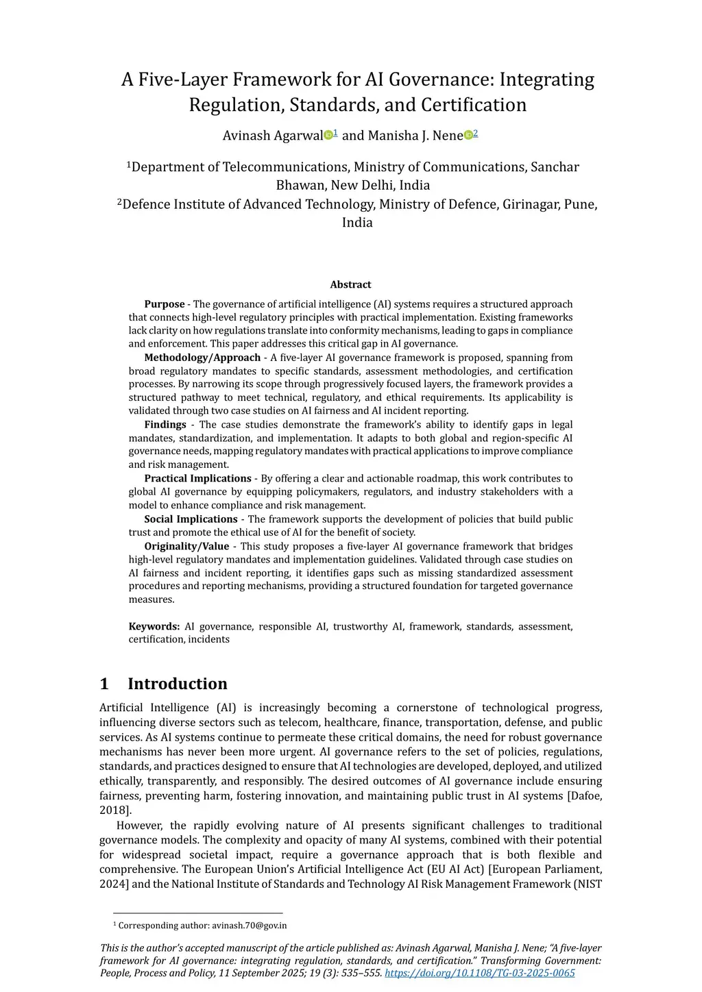 Purpose: The governance of artificial iintelligence (AI) systems requires a structured approach that connects high-level regulatory principles with practical implementation. Existing frameworks lack clarity on how regulations translate into conformity mechanisms, leading to gaps in compliance and enforcement. This paper addresses this critical gap in AI governance.Methodology/Approach: A five-layer AI governance framework is proposed, spanning from broad regulatory mandates to specific standards, assessment methodologies, and certification processes. By narrowing its scope through progressively focused layers, the framework provides a structured pathway to meet technical, regulatory, and ethical requirements. Its applicability is validated through two case studies on AI fairness and AI incident reporting.Findings: The case studies demonstrate the framework's ability to identify gaps in legal mandates, standardization, and implementation. It adapts to both global and region-specific AI governance needs, mapping regulatory mandates with practical applications to improve compliance and risk management.Practical Implications - By offering a clear and actionable roadmap, this work contributes to global AI governance by equipping policymakers, regulators, and industry stakeholders with a model to enhance compliance and risk management.Social Implications: The framework supports the development of policies that build public trust and promote the ethical use of AI for the benefit of society.Originality/Value: This study proposes a five-layer AI governance framework that bridges high-level regulatory mandates and implementation guidelines. Validated through case studies on AI fairness and incident reporting, it identifies gaps such as missing standardized assessment procedures and reporting mechanisms, providing a structured foundation for targeted governance measures.