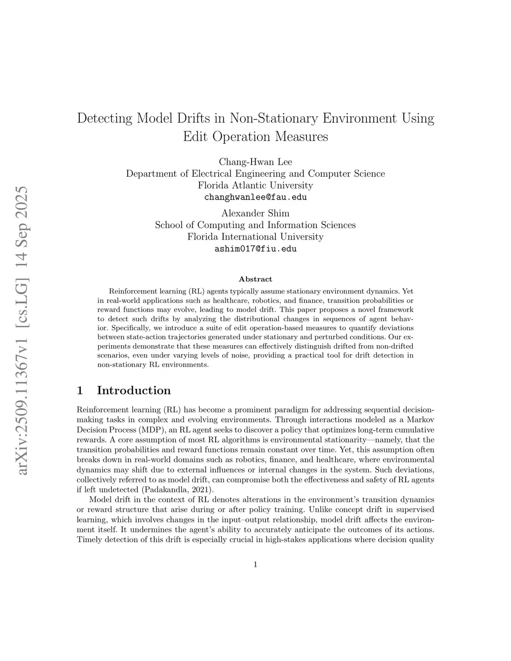 Reinforcement learning (RL) agents typically assume stationary environment dynamics. Yet in real-world applications such as healthcare, robotics, and finance, transition probabilities or reward functions may evolve, leading to model drift. This paper proposes a novel framework to detect such drifts by analyzing the distributional changes in sequences of agent behavior. Specifically, we introduce a suite of edit operation-based measures to quantify deviations between state-action trajectories generated under stationary and perturbed conditions. Our experiments demonstrate that these measures can effectively distinguish drifted from non-drifted scenarios, even under varying levels of noise, providing a practical tool for drift detection in non-stationary RL environments.