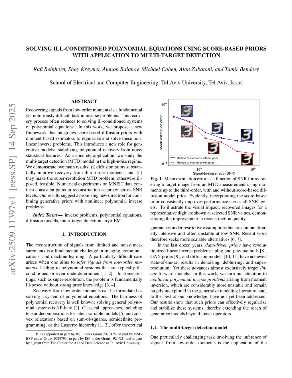 Solving ill-conditioned polynomial equations using score-based priors with application to multi-target detection