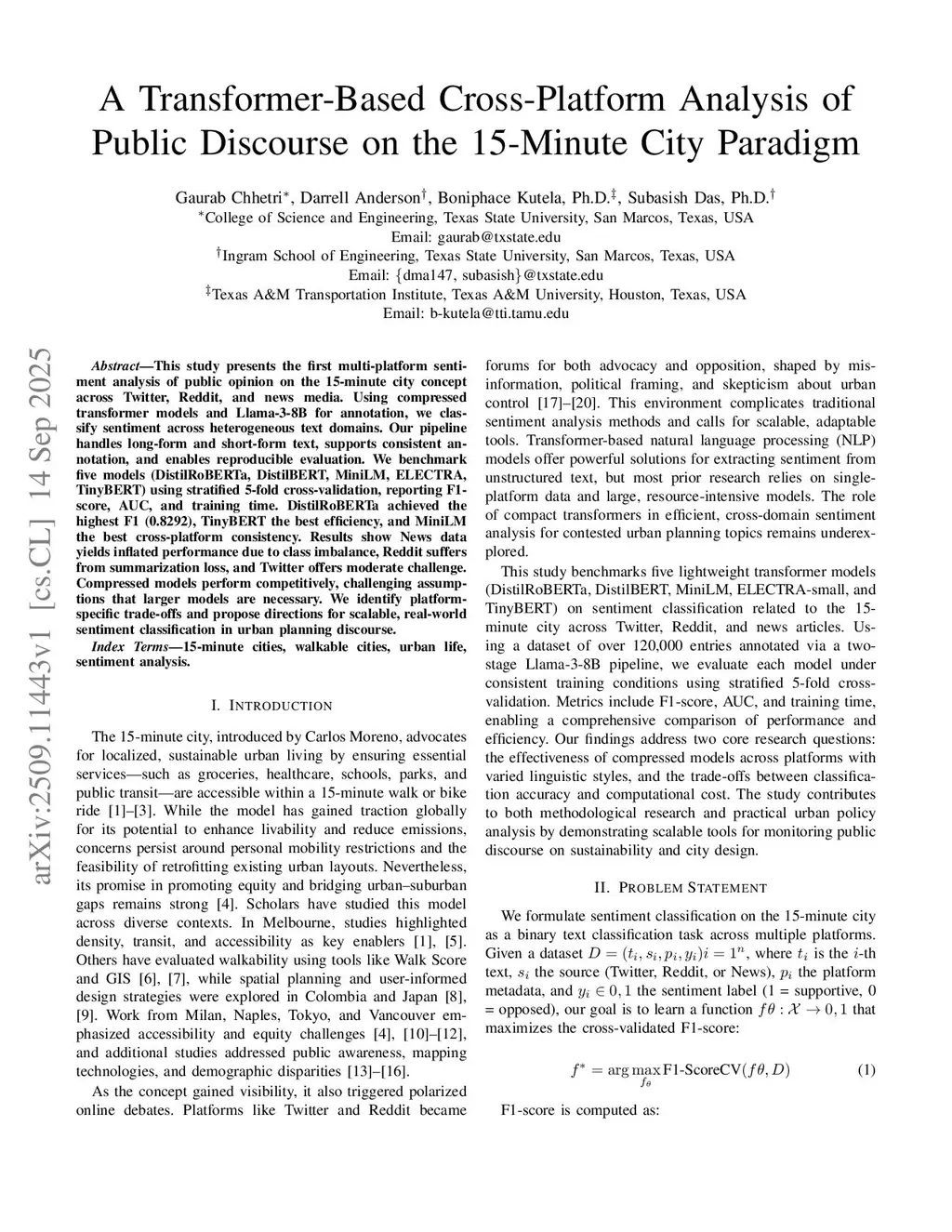 This study presents the first multi-platform sentiment analysis of public opinion on the 15-minute city concept across Twitter, Reddit, and news media. Using compressed transformer models and Llama-3-8B for annotation, we classify sentiment across heterogeneous text domains. Our pipeline handles long-form and short-form text, supports consistent annotation, and enables reproducible evaluation. We benchmark five models (DistilRoBERTa, DistilBERT, MiniLM, ELECTRA, TinyBERT) using stratified 5-fold cross-validation, reporting F1-score, AUC, and training time. DistilRoBERTa achieved the highest F1 (0.8292), TinyBERT the best efficiency, and MiniLM the best cross-platform consistency. Results show News data yields inflated performance due to class imbalance, Reddit suffers from summarization loss, and Twitter offers moderate challenge. Compressed models perform competitively, challenging assumptions that larger models are necessary. We identify platform-specific trade-offs and propose directions for scalable, real-world sentiment classification in urban planning discourse.