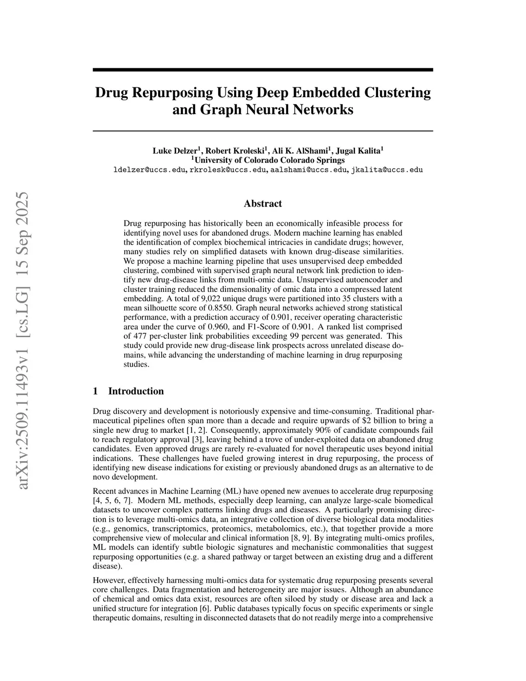 Drug repurposing has historically been an economically infeasible process for identifying novel uses for abandoned drugs. Modern machine learning has enabled the identification of complex biochemical intricacies in candidate drugs; however, many studies rely on simplified datasets with known drug-disease similarities. We propose a machine learning pipeline that uses unsupervised deep embedded clustering, combined with supervised graph neural network link prediction to identify new drug-disease links from multi-omic data. Unsupervised autoencoder and cluster training reduced the dimensionality of omic data into a compressed latent embedding. A total of 9,022 unique drugs were partitioned into 35 clusters with a mean silhouette score of 0.8550. Graph neural networks achieved strong statistical performance, with a prediction accuracy of 0.901, receiver operating characteristic area under the curve of 0.960, and F1-Score of 0.901. A ranked list comprised of 477 per-cluster link probabilities exceeding 99 percent was generated. This study could provide new drug-disease link prospects across unrelated disease domains, while advancing the understanding of machine learning in drug repurposing studies.