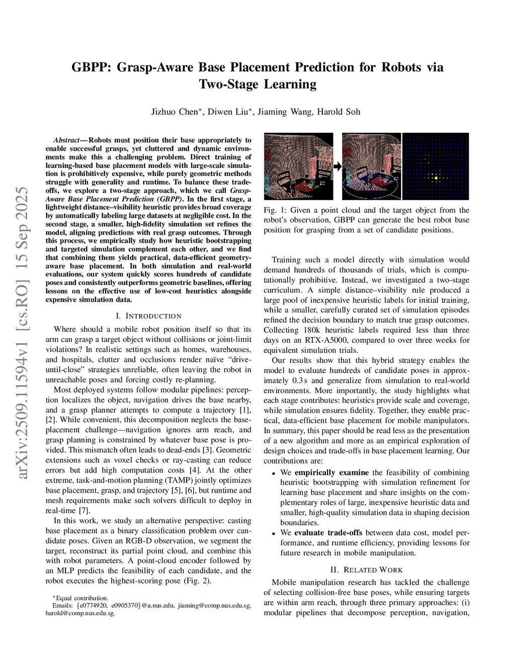 GBPP is a fast learning based scorer that selects a robot base pose for grasping from a single RGB-D snapshot. The method uses a two stage curriculum: (1) a simple distance-visibility rule auto-labels a large dataset at low cost; and (2) a smaller set of high fidelity simulation trials refines the model to match true grasp outcomes. A PointNet++ style point cloud encoder with an MLP scores dense grids of candidate poses, enabling rapid online selection without full task-and-motion optimization. In simulation and on a real mobile manipulator, GBPP outperforms proximity and geometry only baselines, choosing safer and more reachable stances and degrading gracefully when wrong. The results offer a practical recipe for data efficient, geometry aware base placement: use inexpensive heuristics for coverage, then calibrate with targeted simulation.