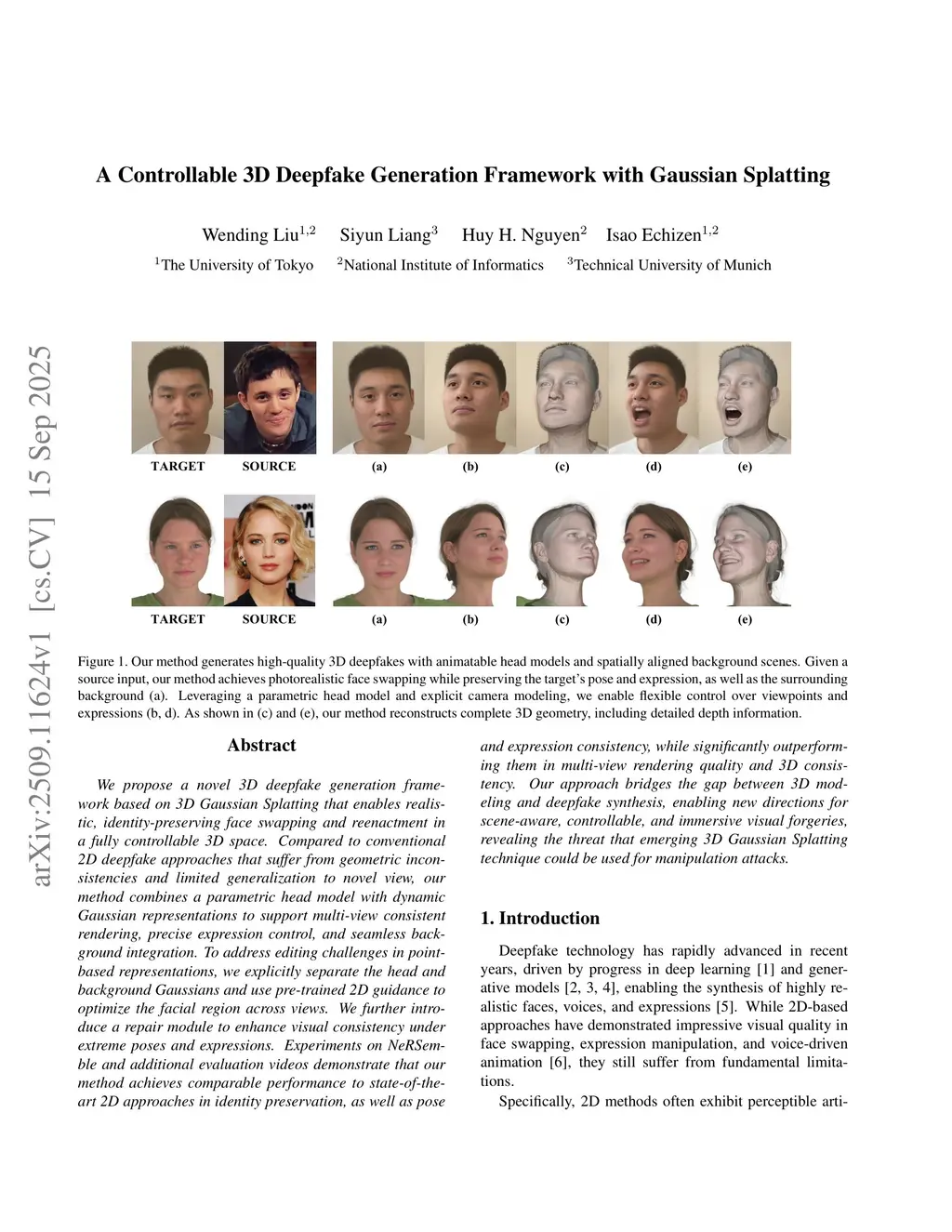 We propose a novel 3D deepfake generation framework based on 3D Gaussian Splatting that enables realistic, identity-preserving face swapping and reenactment in a fully controllable 3D space. Compared to conventional 2D deepfake approaches that suffer from geometric inconsistencies and limited generalization to novel view, our method combines a parametric head model with dynamic Gaussian representations to support multi-view consistent rendering, precise expression control, and seamless background integration. To address editing challenges in point-based representations, we explicitly separate the head and background Gaussians and use pre-trained 2D guidance to optimize the facial region across views. We further introduce a repair module to enhance visual consistency under extreme poses and expressions. Experiments on NeRSemble and additional evaluation videos demonstrate that our method achieves comparable performance to state-of-the-art 2D approaches in identity preservation, as well as pose and expression consistency, while significantly outperforming them in multi-view rendering quality and 3D consistency. Our approach bridges the gap between 3D modeling and deepfake synthesis, enabling new directions for scene-aware, controllable, and immersive visual forgeries, revealing the threat that emerging 3D Gaussian Splatting technique could be used for manipulation attacks.