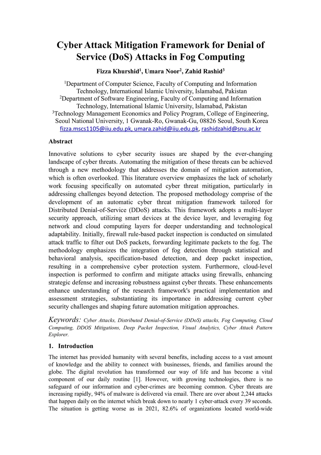 Cyber Attack Mitigation Framework for Denial of Service (DoS) Attacks in Fog Computing